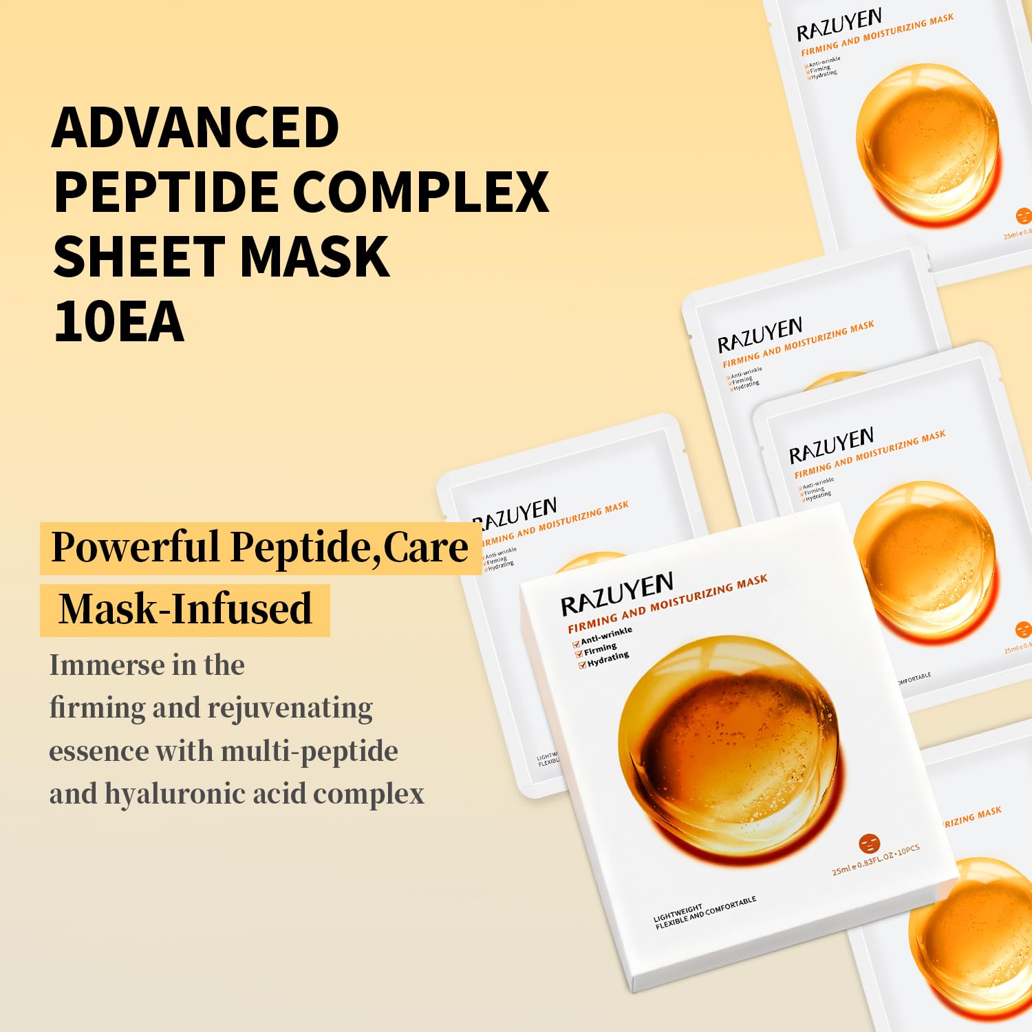 Firming and Moisturizing Sheet Face Masks (Pack of 10) with Hyaluronic Acid and Peptides, Reduce Fine Lines and Wrinkles, Hydrating & Anti-Aging Spa Face Mask, Facial Skin Care