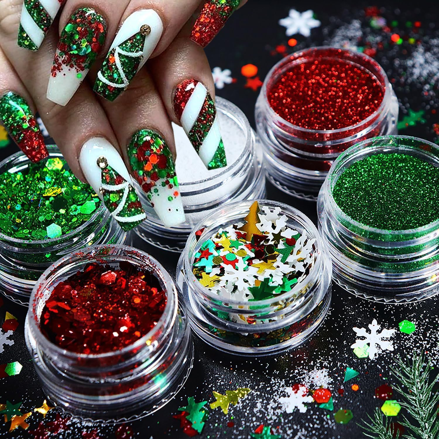 - 【Safe Material】-- The Xmas nail glitter sequins are made of high quality material, safe and skin-friendly, you can use it confidence. Acrylic powder can be used with both UV Gel Polish and normal nail polish.