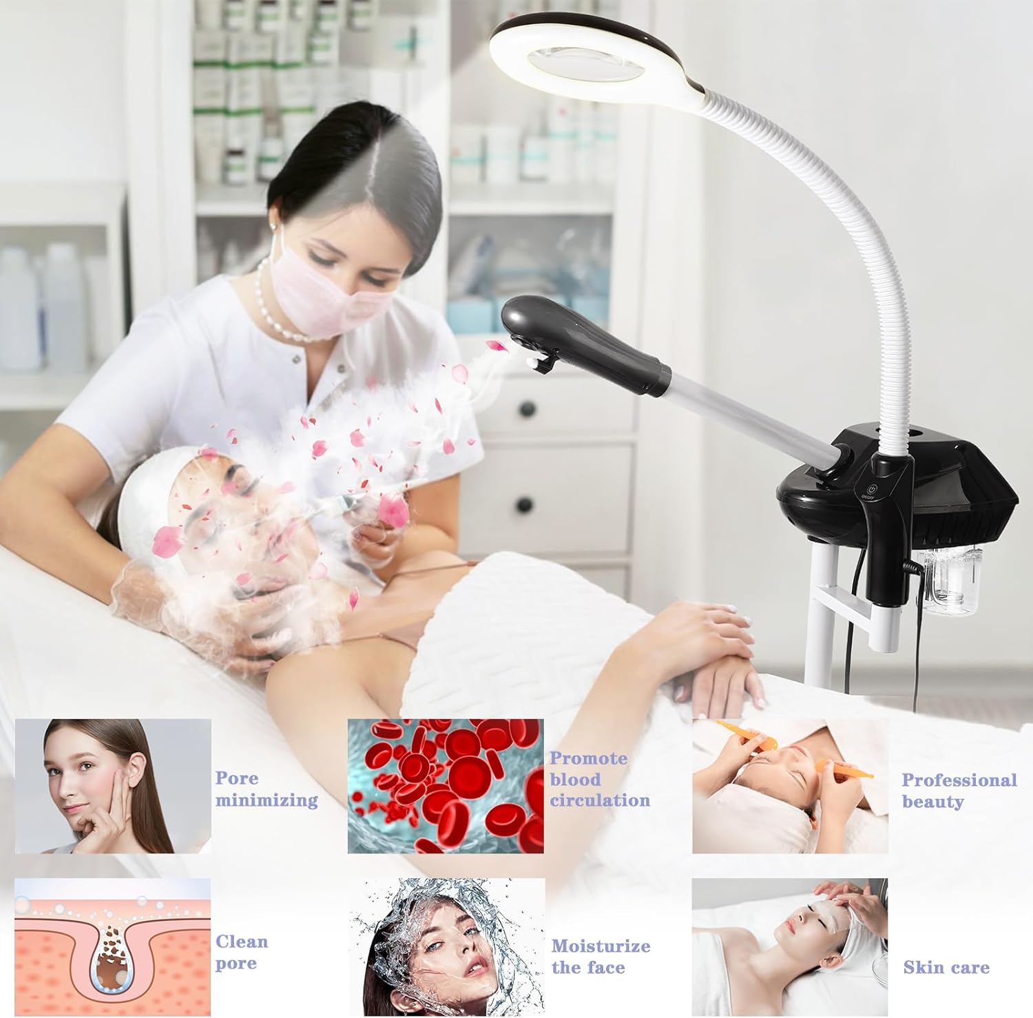 - 【2 in 1 Facial Steamer】 The 5x magnifying with adjustable light and flexible arm, designed for more convenient use, mobile facial steamer with wheels allows you to lie down or sit down to enjoy the spa aromatherapy.
