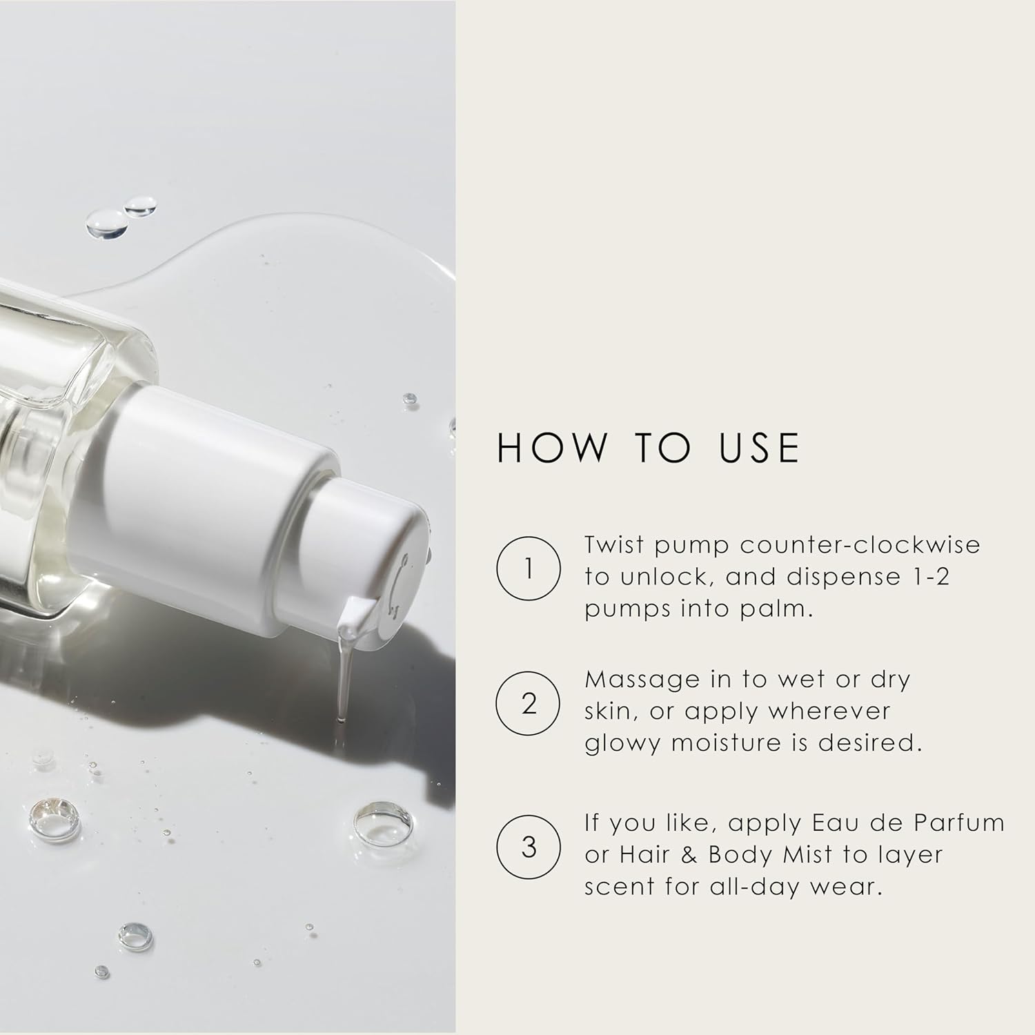 - Dispense 1-2 pumps into palm. Massage in to wet or dry skin or apply wherever glowy moisture is desired. If you like, apply Eau de Parfum or Hair & Body Mist to layer scent for all-day wear.