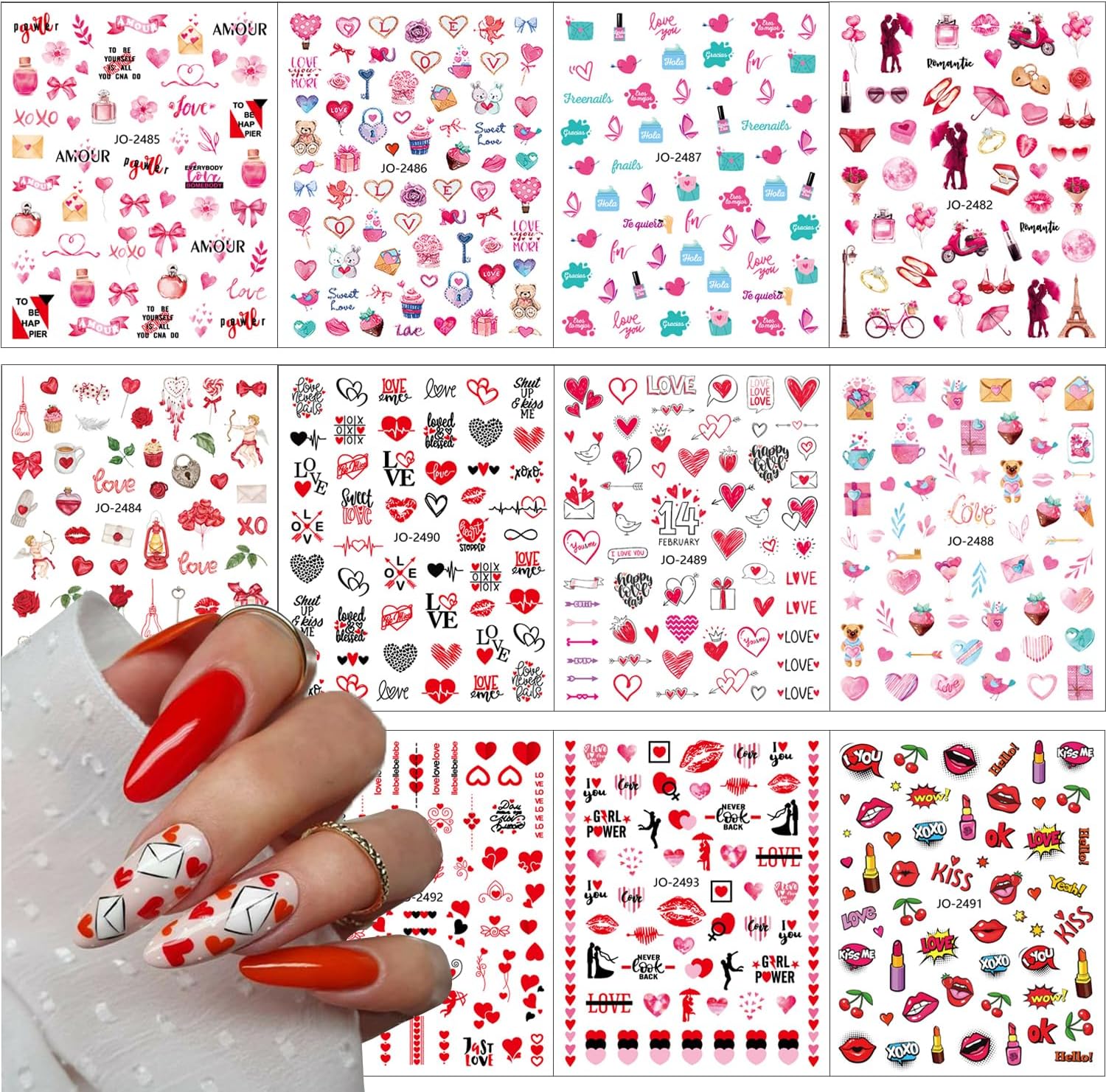 - 【Valentines Stickers Package Set】You will get 12 sheets heart nail art stickers, various patterns nail designs decoration.Self-Adhesive Valentines day nail decals provides you with a variety of options to give full play to your rich imagination of nail DIY.