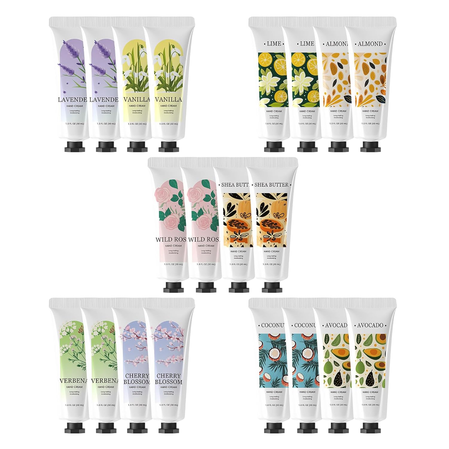 - 20 Pack and 10 Natural Scents for Every Mood – This hand cream set includes 10 delightful scents: lavender, vanilla, verbena, cherry blossom, wild rose, shea butter, coconut, lime, avocado, and almond. Each scent is naturally refreshing, making this hand lotion gift set both versatile and enjoyable for daily use. Perfect for anyone who loves a variety of mini hand lotion options.