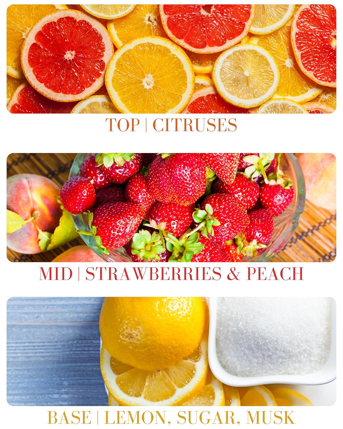 - SCENT PROFILE - Top: Citruses Mid: Strawberries, Peach, Base: Lemon, Sugar, Musk. Delicious fresh strawberries and peach lemon sprinkled with citrus sugar and just a waft of musk.