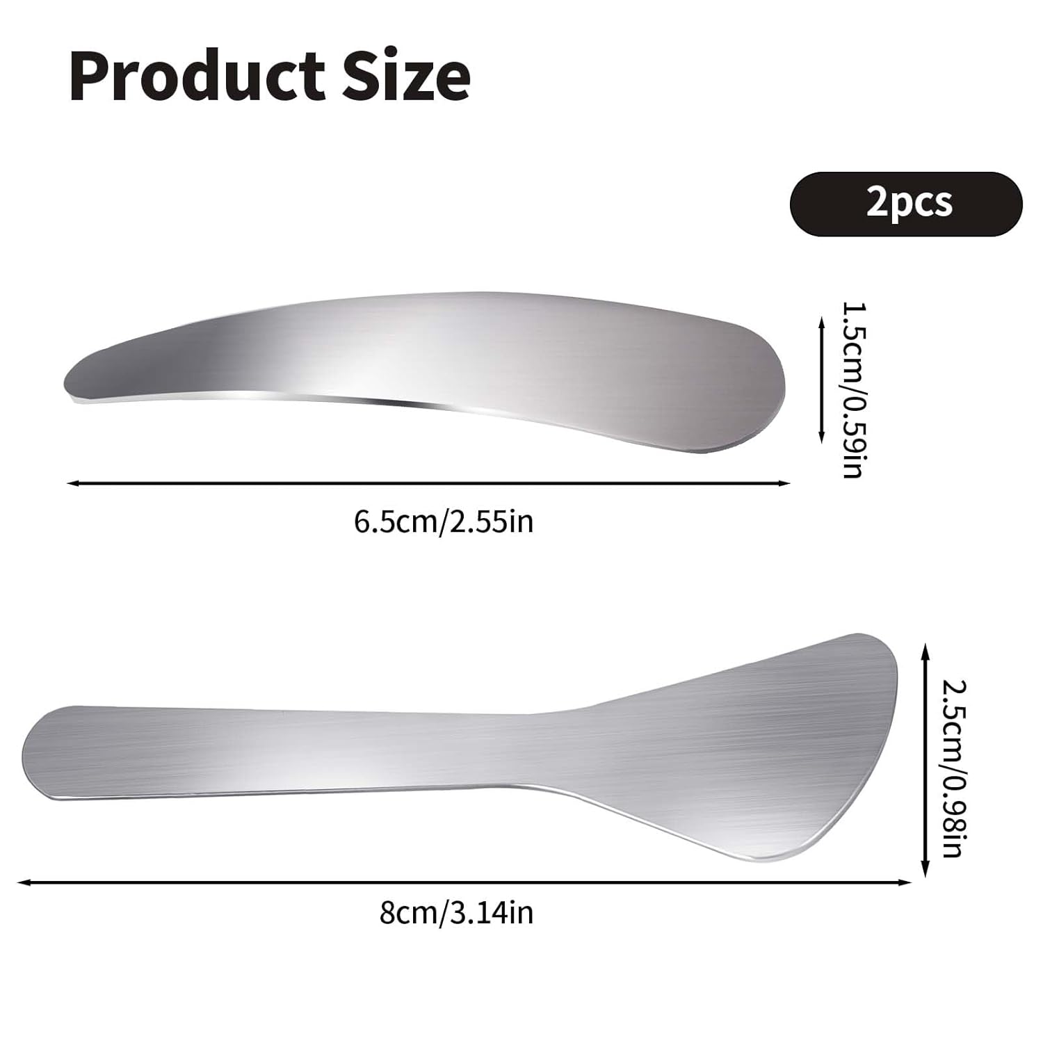 - 【Packaging List】 The package contains 2 mini stainless steel cosmetic spatulas, 2 shapes, silver color.