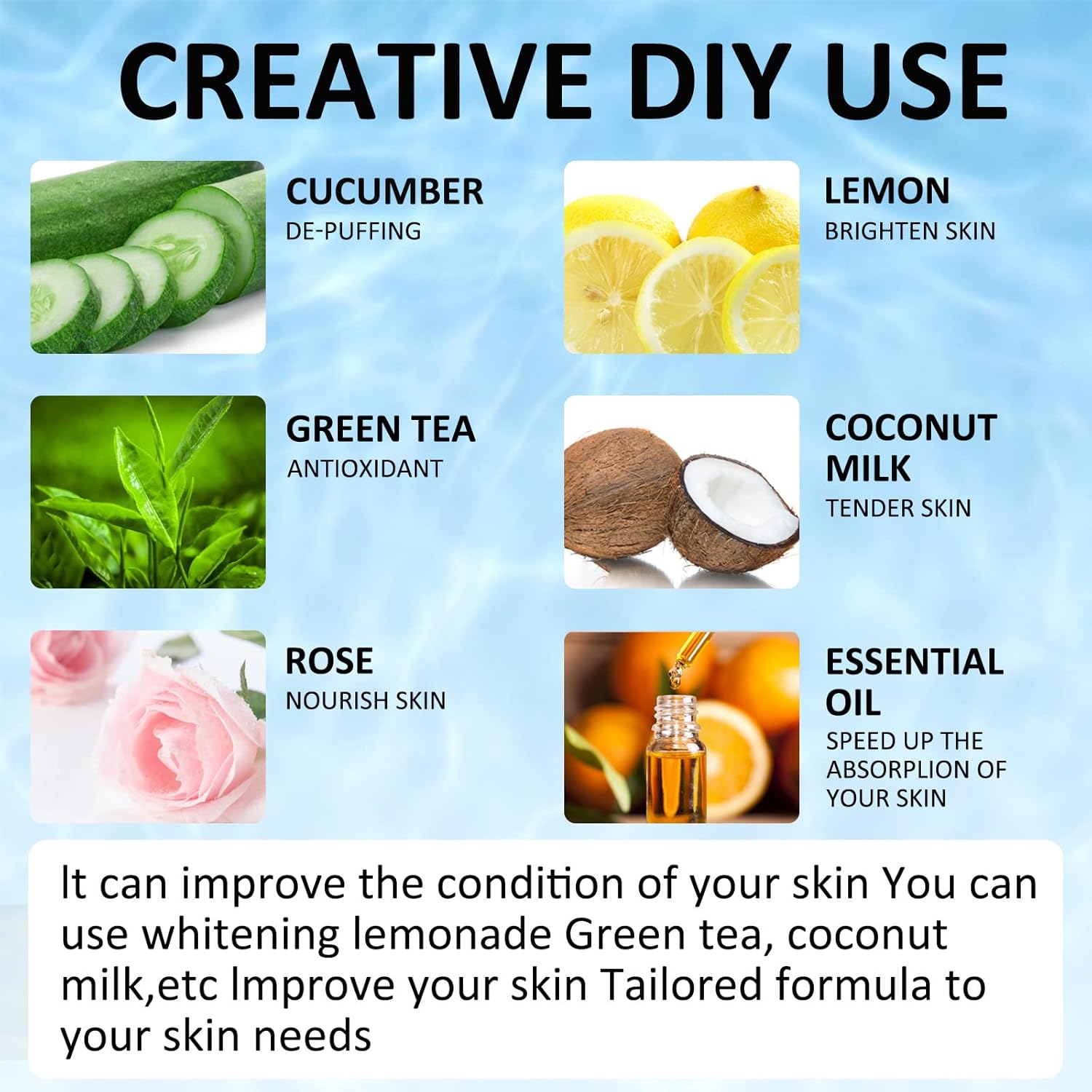 - 【Creative Formula】-- You can use lemon water for whitening, coconut milk for anti-aging, cucumber water for puffiness, green tea for anti-inflammation, aloe vera for acne-prone skin and sunburn, rose essential oil for tightening pores; Creatively tailor the recipe to your skin needs.