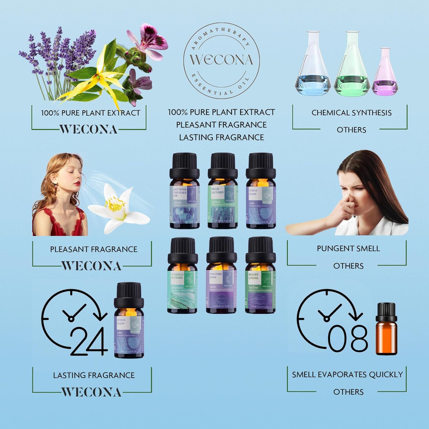 - Comprehensive Meeting of Expectations: The WECONA aromatherapy oils set provides you with a comprehensive selection of fresh scents for your home space, laundry, and personal care. Whether it's for your living space or personal items, you can find the most suitable essential oils. This allows you to experience a relaxing and pleasant freshness amidst your busy life.