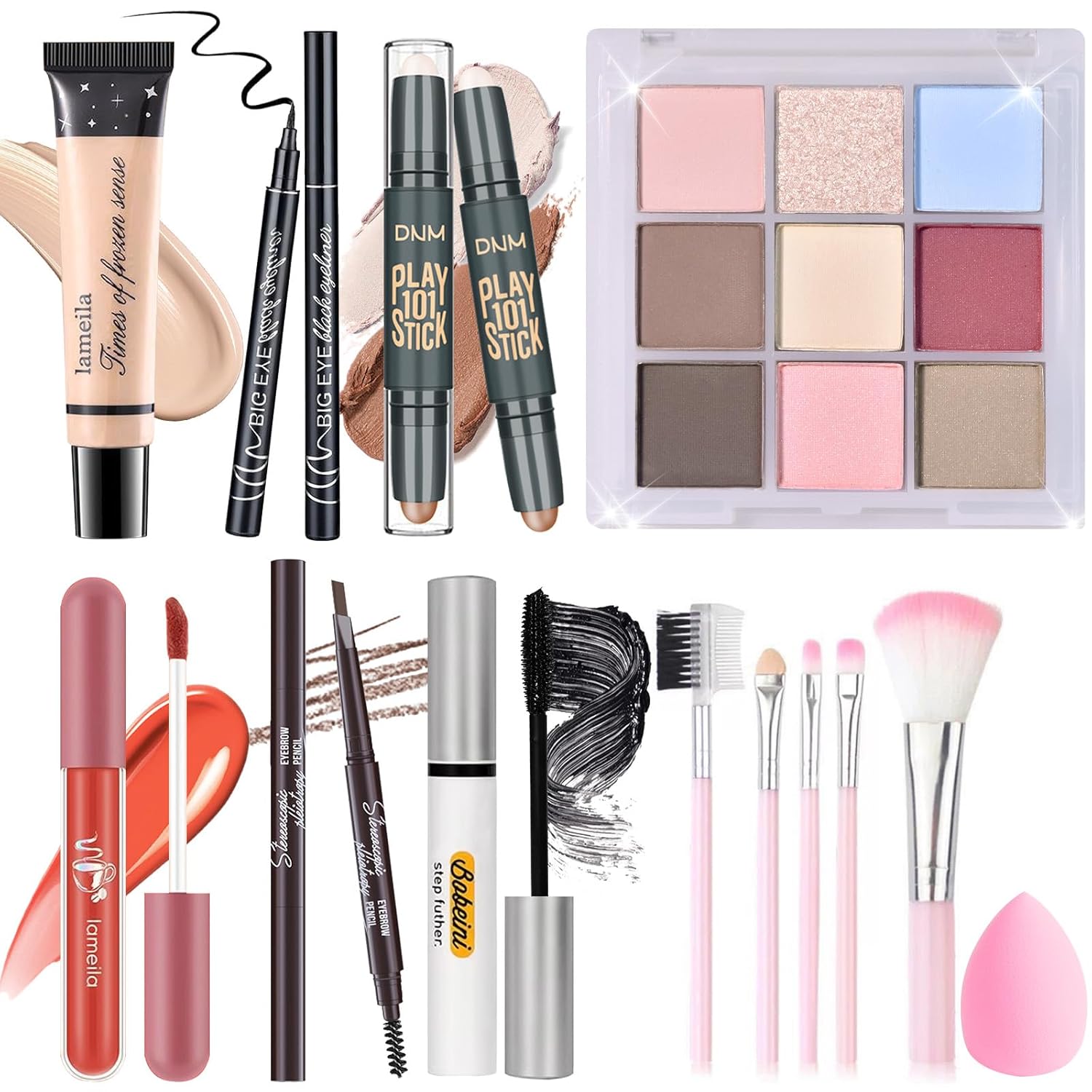 - [Makeup Set] The ideal starter makeup kit includes 9 colors eyeshadow palette, dual-ended counter and highlighter stick, full coverage liquid foundation, dual-ended eyebrow pencil, eyeliner, waterproof mascara, lip gloss, 5 PCs makeup brushes set, makeup sponge. All women’s makeup essentials are included.