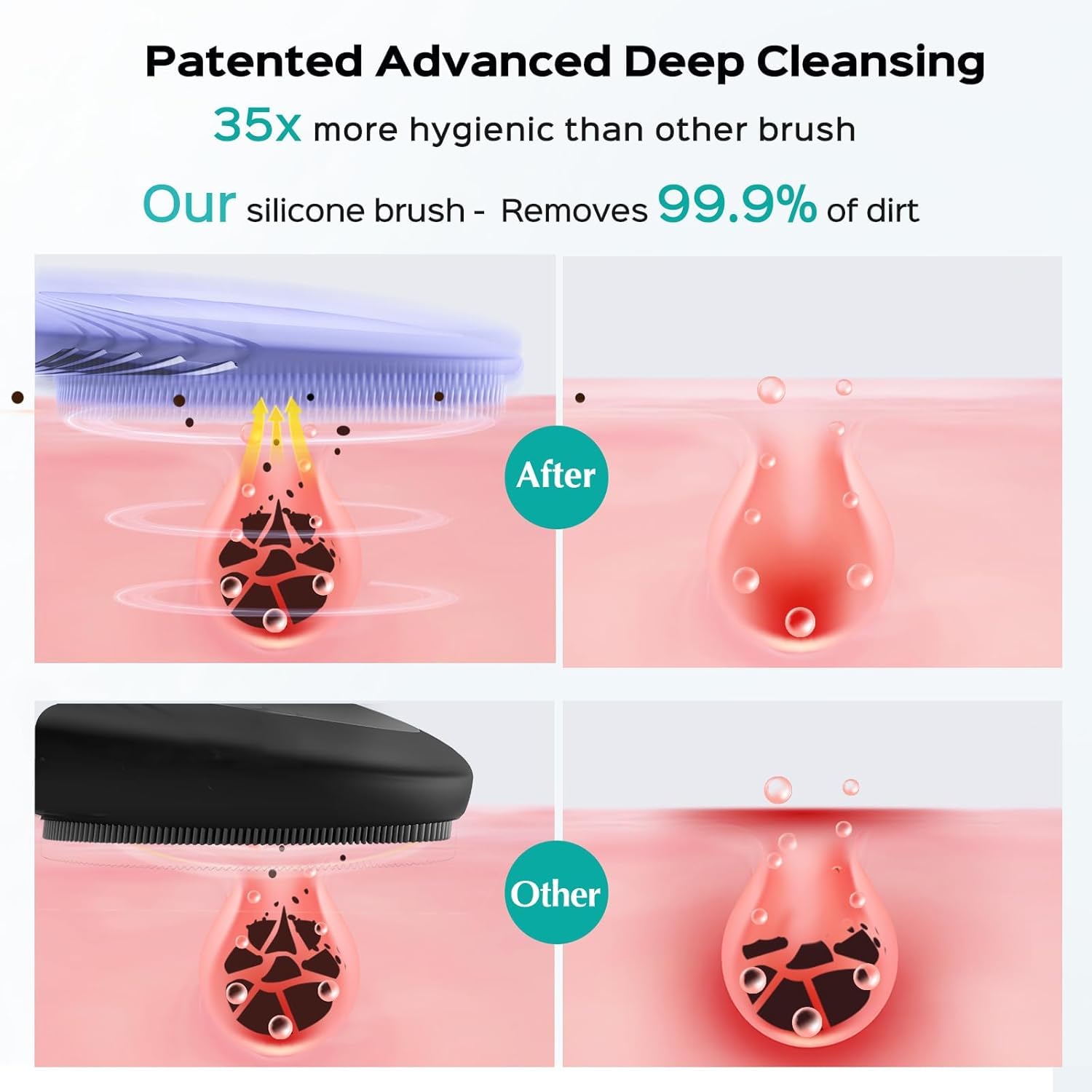 - FULL FACE CLEANSING DESIGN: Compared to other similar products on the market, our silicone facial scrubber features thickened soft silicone bristles at the top, making it easy to clean hard-to-reach areas such as the sides of the nose and the T-zone. The large-area ultra-fine brush is suitable for daily large-area cleaning. After full face cleansing, it allows your moisturizer, serums, and other skincare products to be absorbed more easily by the skin, maximizing their effectiveness. 99% of users experience better absorption of skincare products