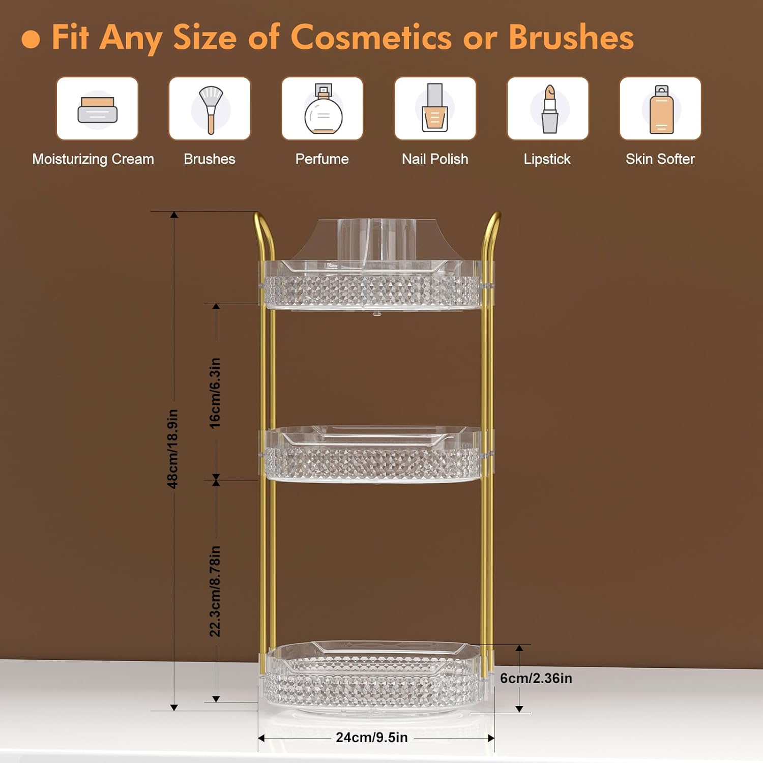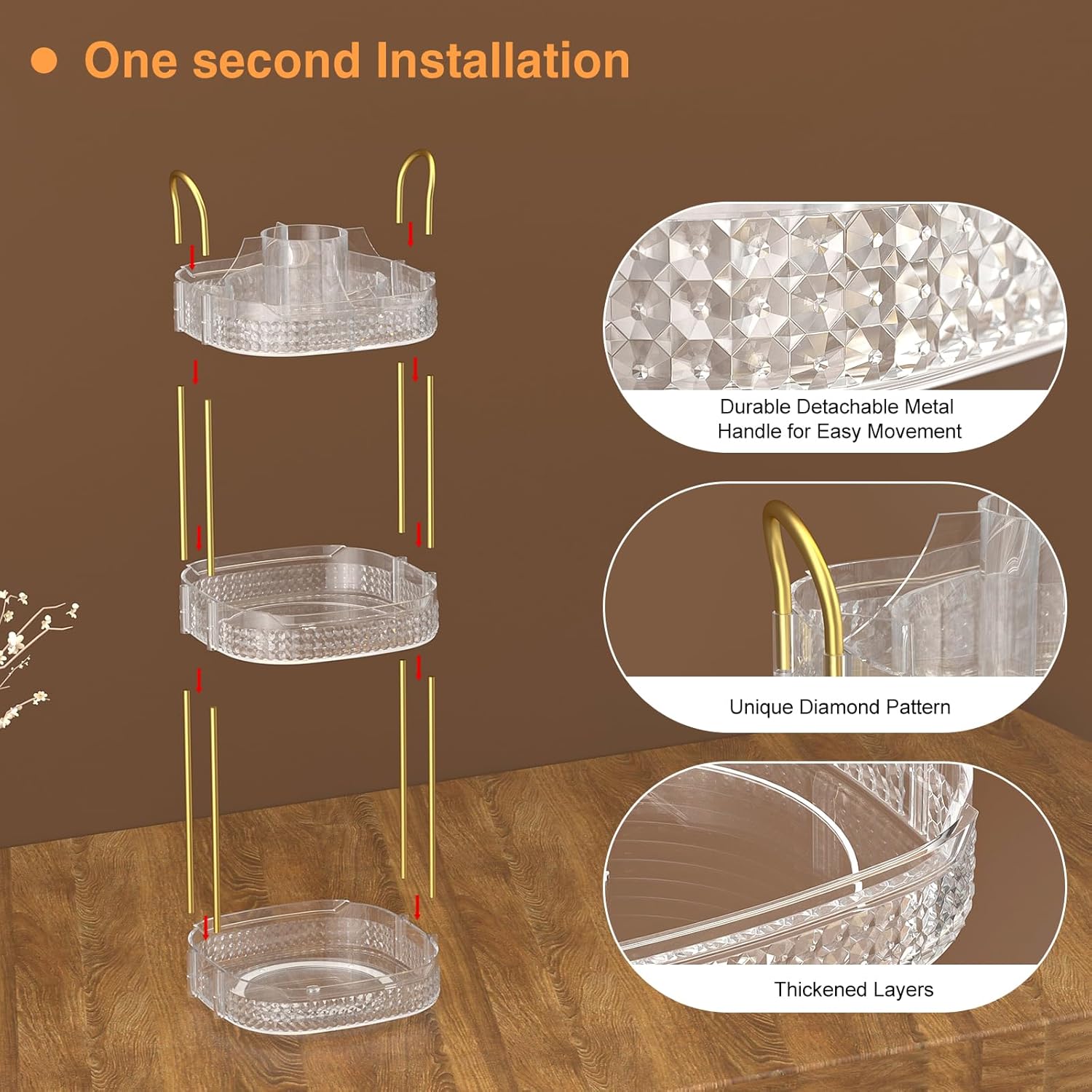Awenia Rotating Makeup Organizer 360, Stackable Adjustable Large Capacity Cosmetic Storage Unit,Dresser Bathroom Kitchen Countertop Organizer with Metal Handle, Plus Size (Clear, 3 Tier)