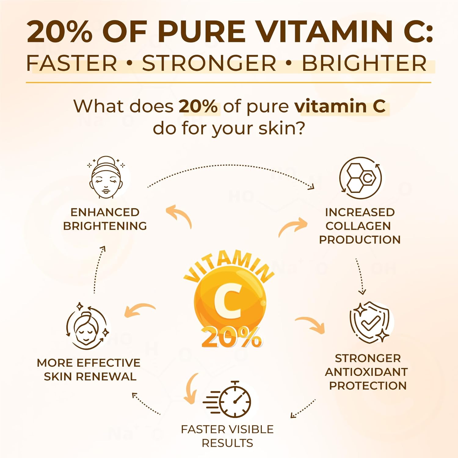 - CLEAN, ALL NATURAL & GENTLE FORMULA: Made with 100% naturally derived ingredients—free of parabens, sulfates, and harsh chemicals. This 20% pure Vitamin C face serum combines 6 active boosters (Niacinamide, Hyaluronic Acid, Ferulic Acid, Vitamin E, Peptides, Green Tea) for visible results without irritation.