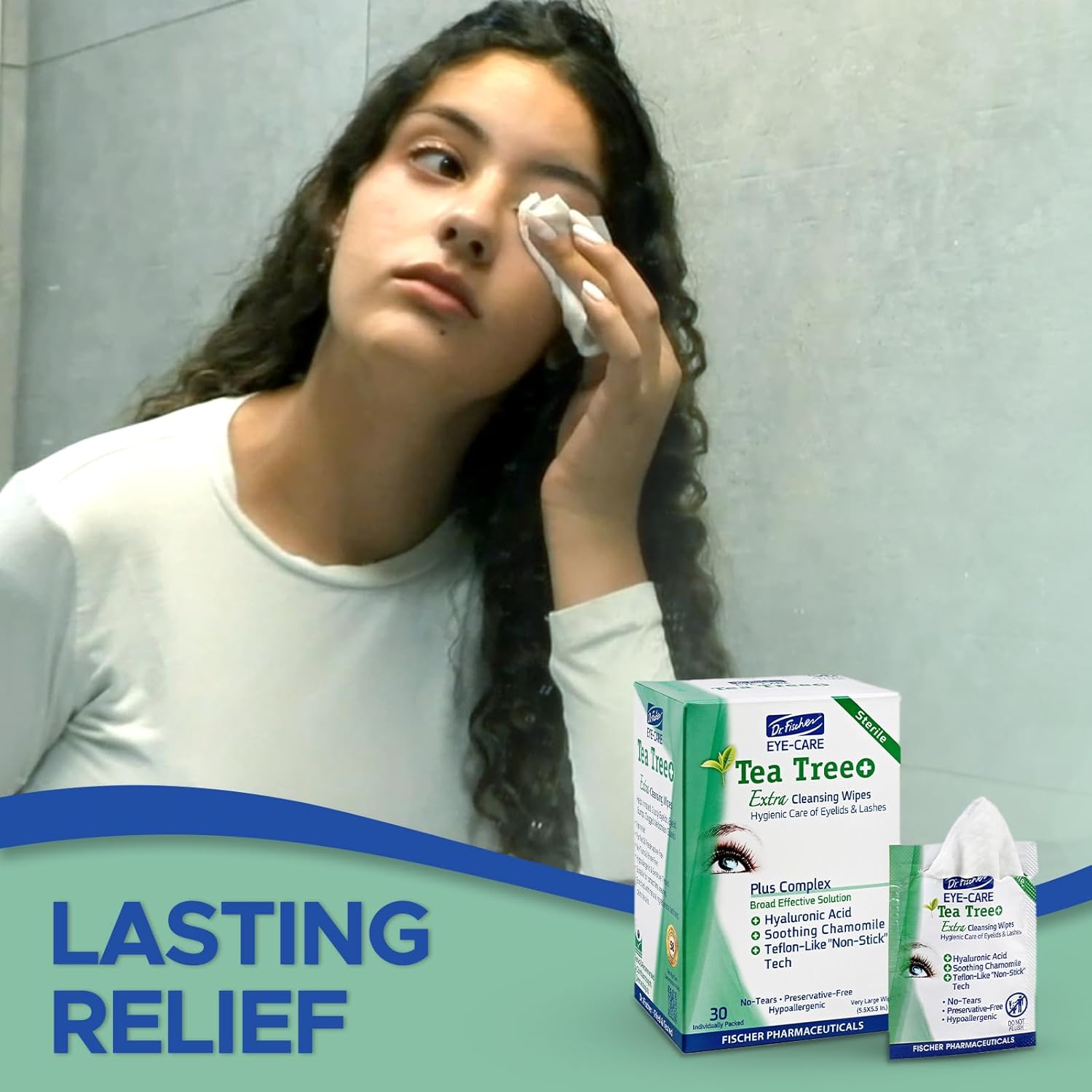 Dr. Fischer Tea Tree Oil Eye Wipes - Eyelid Wipes for Sensitive Eyes with Hyaluronic Acid and Chamomile, Makeup Remover, Daily Cleanser (30 wipes)