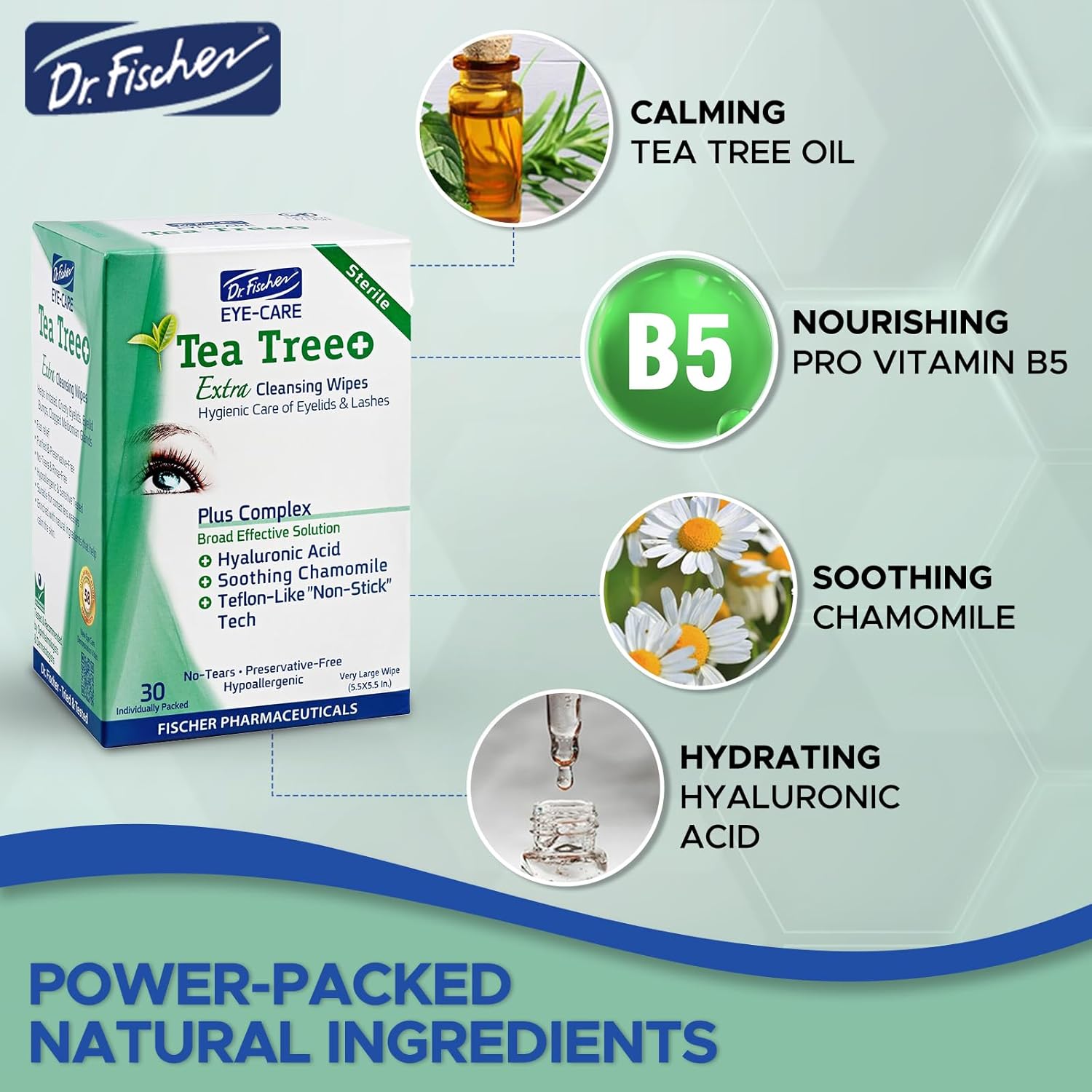 Dr. Fischer Tea Tree Oil Eye Wipes - Eyelid Wipes for Sensitive Eyes with Hyaluronic Acid and Chamomile, Makeup Remover, Daily Cleanser (60 wipes)
