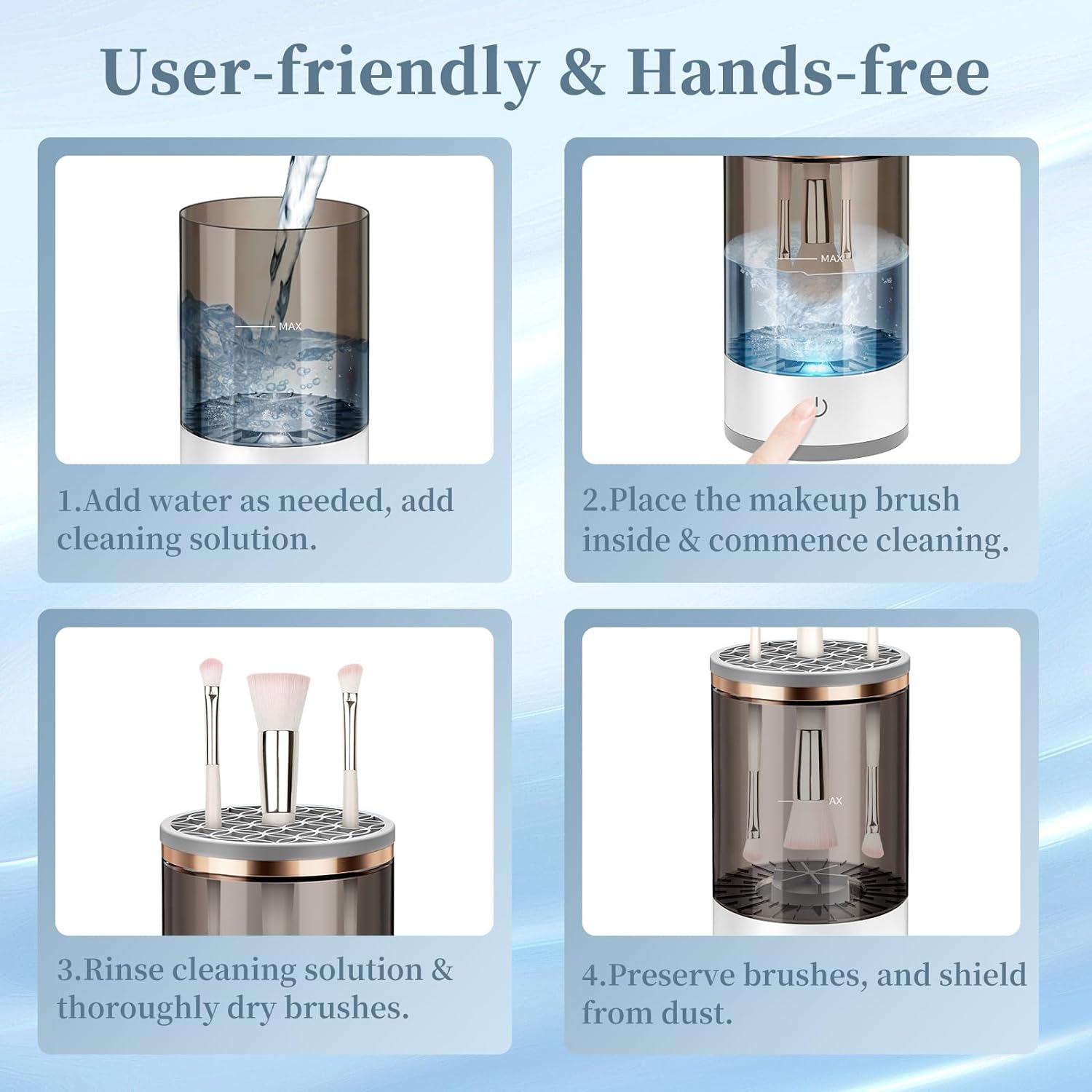 - Deep Cleaning with No Dead Spots: With powerful water flow and a rotating brush head design, the cleaner reaches deep into the bristles, removing hard-to-clean makeup residue and bacteria, ensuring the hygiene and safety of your brushes.