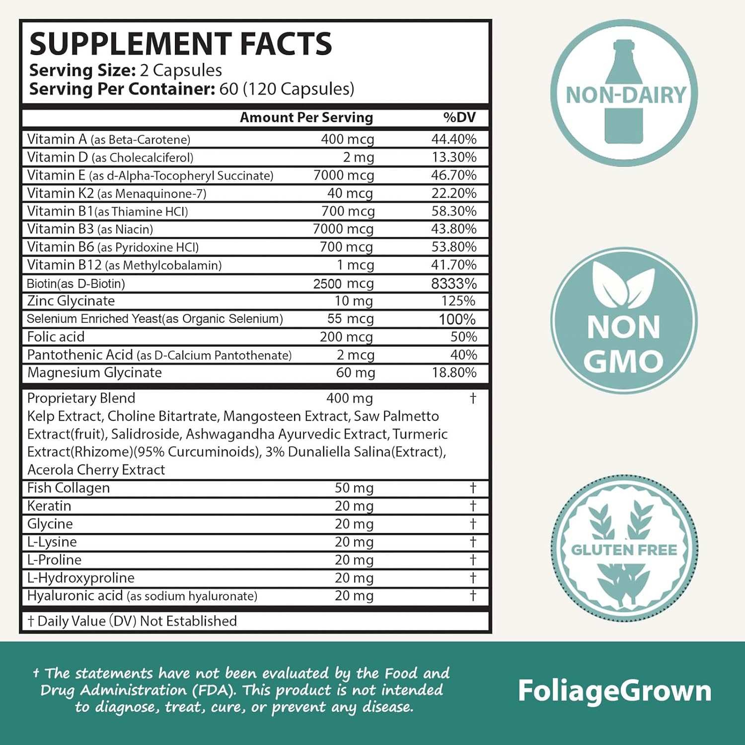 - Biotin 2500 mcg : Plant and algae extracts, along with amino acids, in FoliageGrown's unique formula provide comprehensive scalp care, improving moisture, elasticity, and environmental protection for a healthy, youthful look