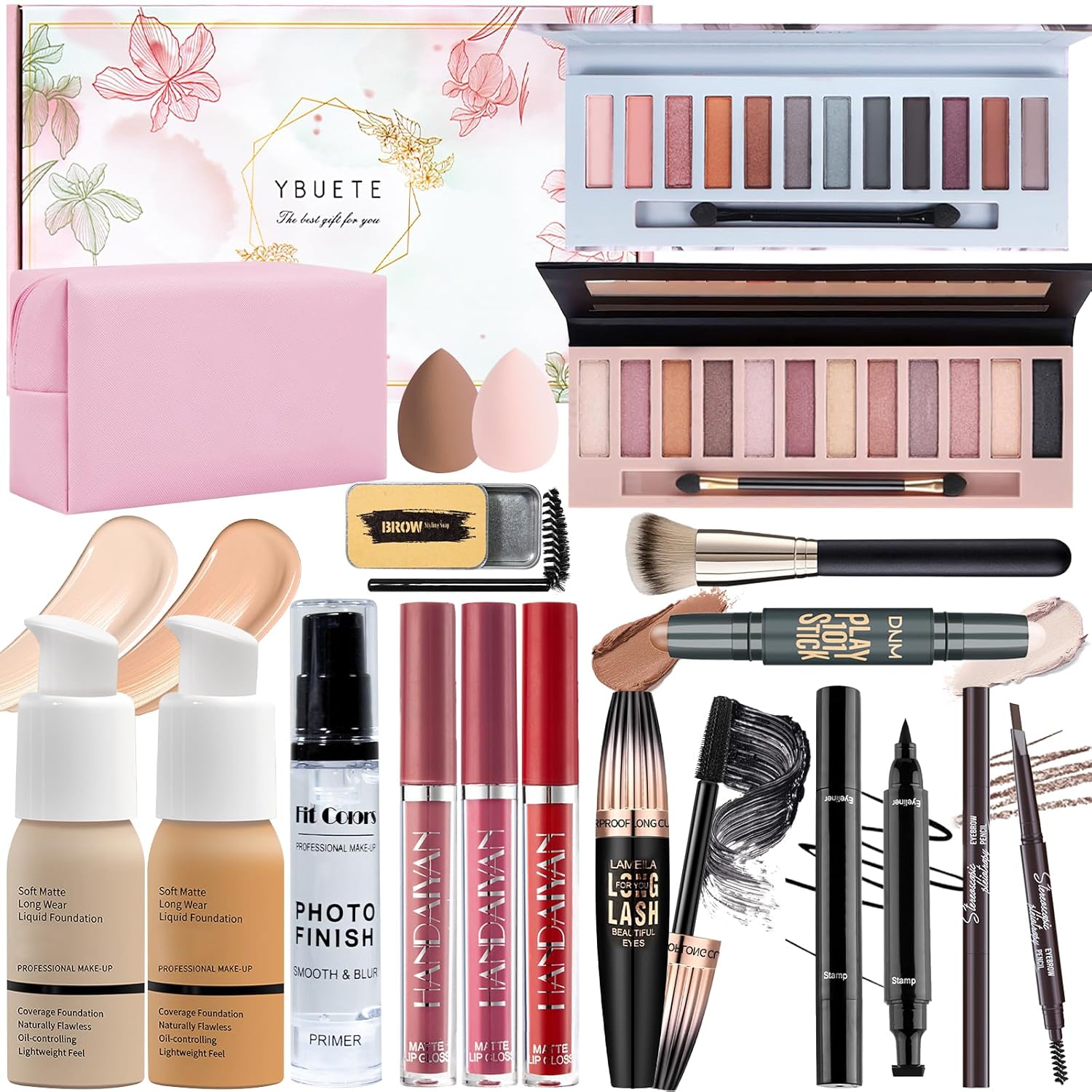 - [Full Face Makeup Set] The multipurpose makeup gift set for women includes Full Coverage Nude & Buff Beige Foundation, Matte & Shimmer 12 Colors Eyeshadow Palette, 3pcs Liquid Lipsticks, Face Primer, Dual-Ended Counter Stick, Waterproof Cosmetic Bag, Eyebrow Soap set, Dual-ended Eyebrow Pencil, Winged Eyeliner Stamp, Waterproof Mascara, Makeup Brush & 2PCs Makeup Sponges. It can meet all the beginners’ or professional makeup artists’ needs for daily makeup.