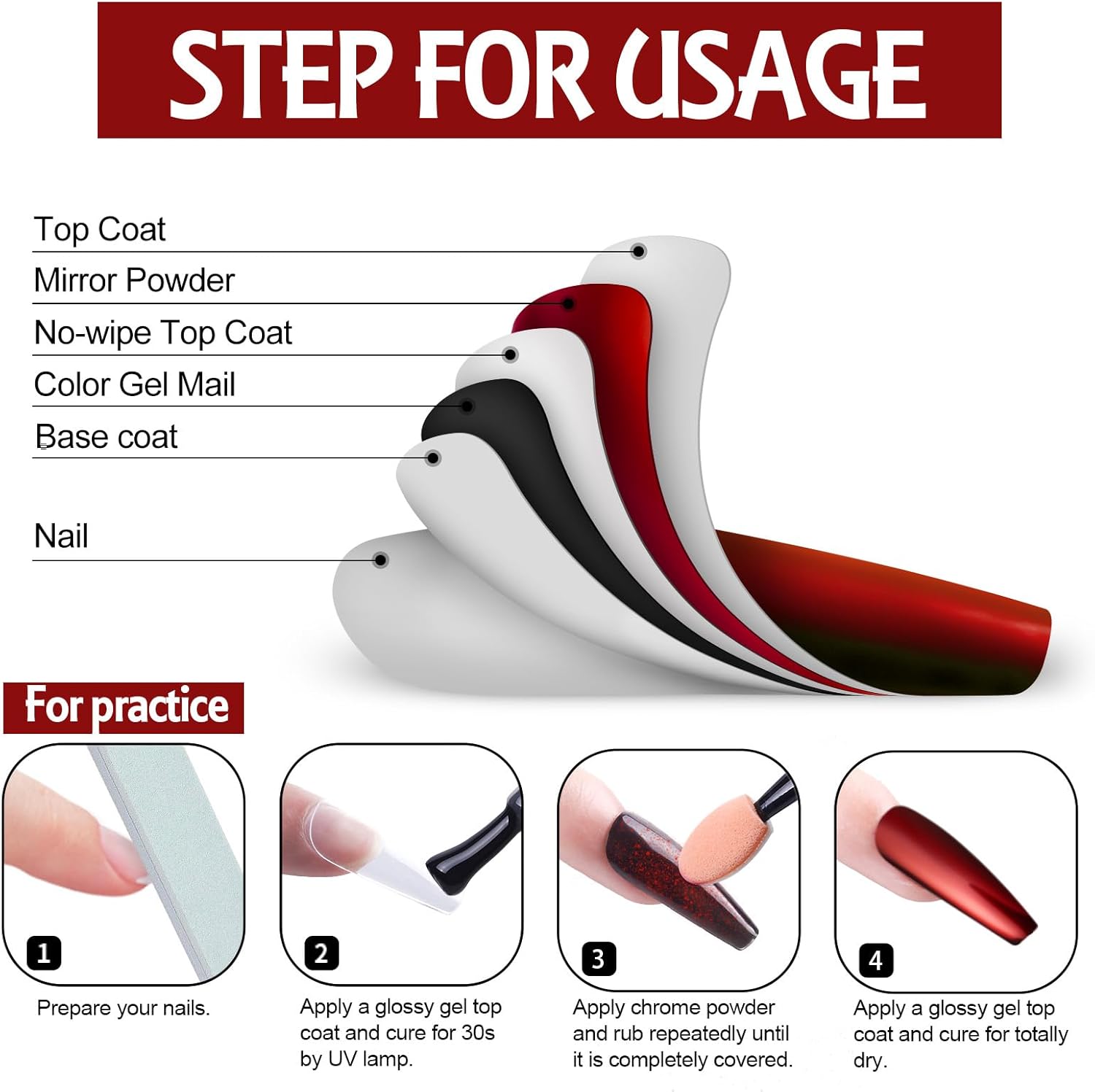 - 【WIDE APPLICATION】:These powders need to be used with Gel nail polish(color gel,gel base coat and glossy gel top coat). Some regular Polish can also be used, but not all. These powders can be used on natural nails, UV gel nails, acrylic nails or false nail tips. You can use them very easily. It is a good solution with rhinestones 、nail art fimo or other accessories to build a nice nail art.