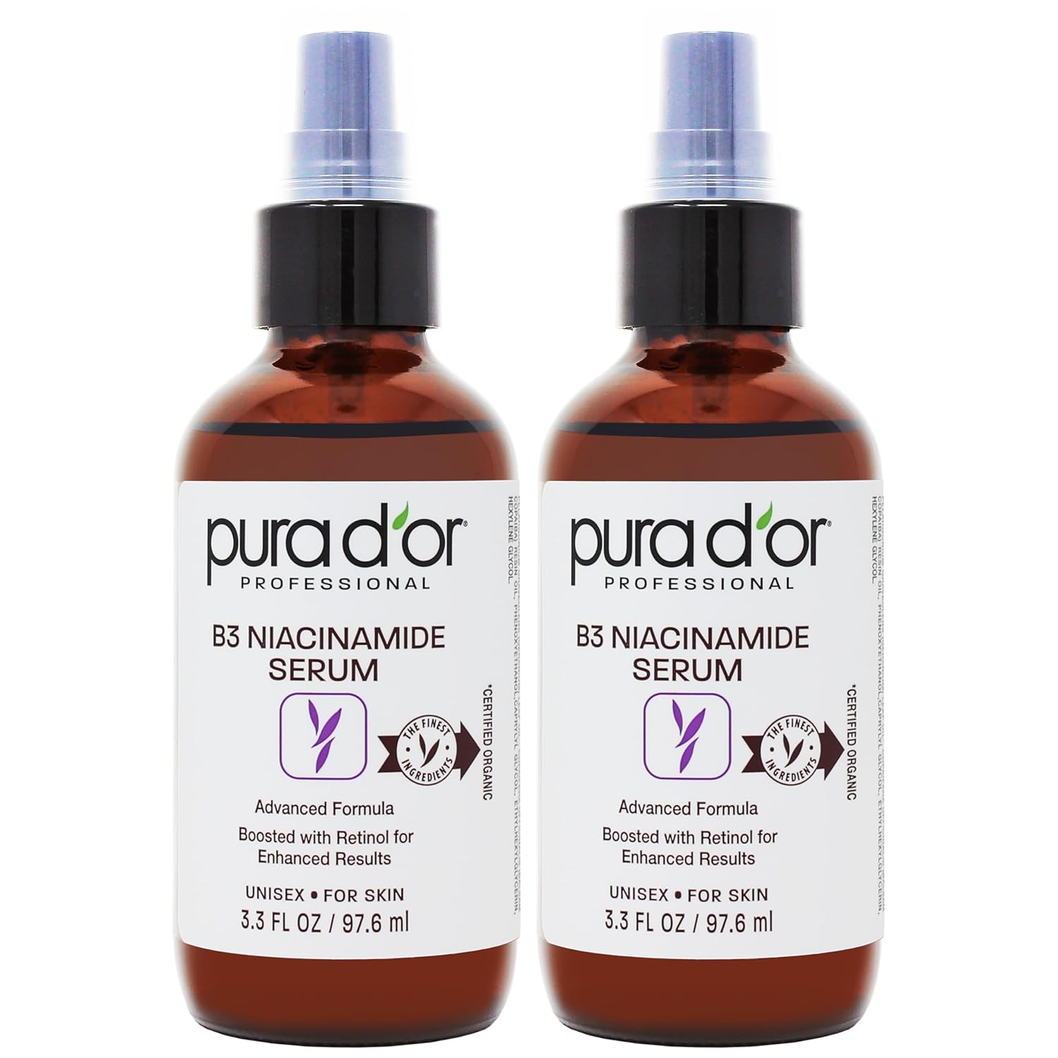 PURA D'OR B3 Niacinamide Advanced Facial Serum (3.3oz x2 = 6.6oz) Skin Care Formula with Retinol For Wrinkles, Hydration & Complexion - All Skin Types, Hypoallergenic - Women & Men