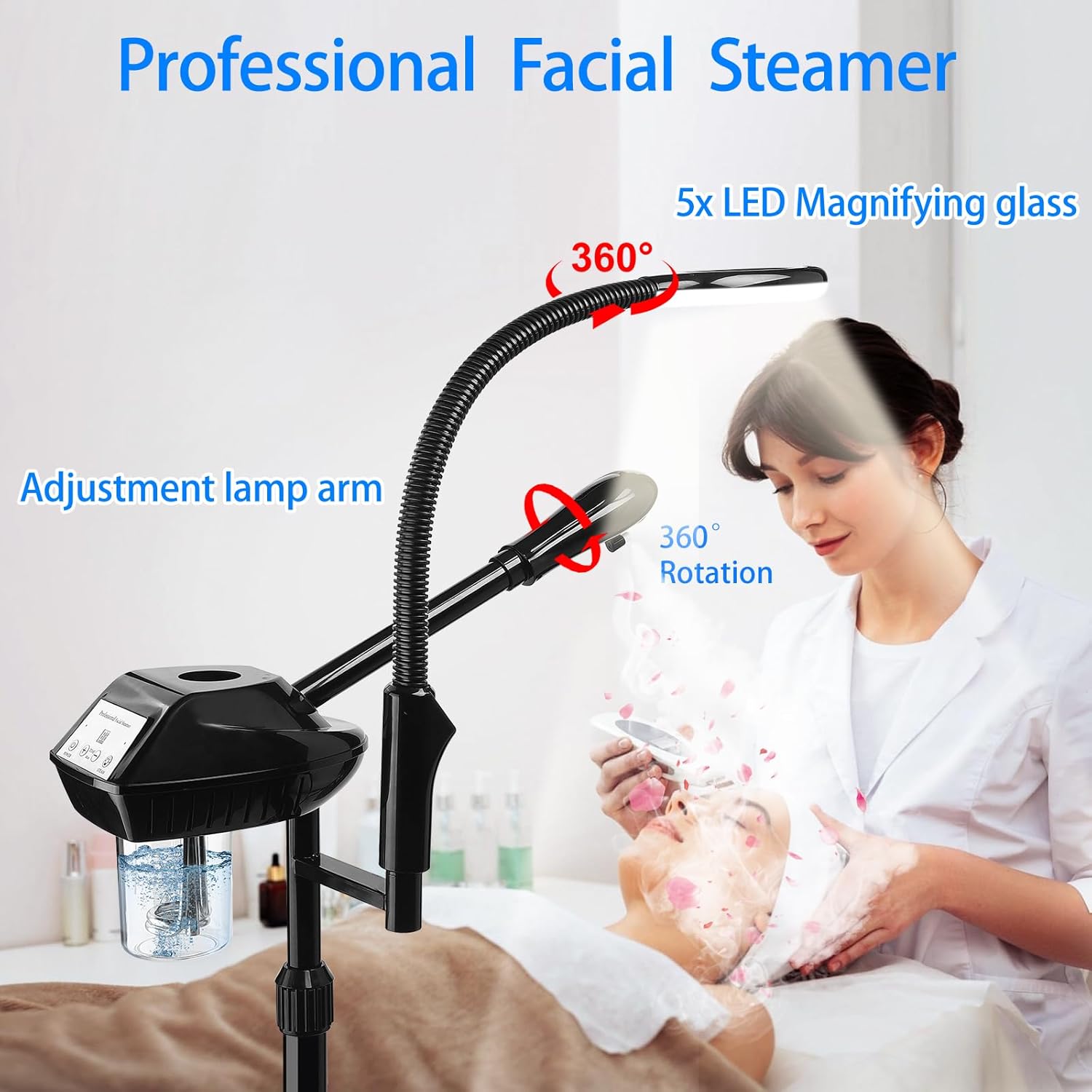 - 【Facial Steamer Professional】Facial steamer for esthetician is easy to operate, steam can open the pores of the depth of the skin cleansing, The 5x magnifying with adjustable beauty light and flexible adjustable arm, High quality steamer magnifier can help you see details more clearly, for different needs of salon and SPA.