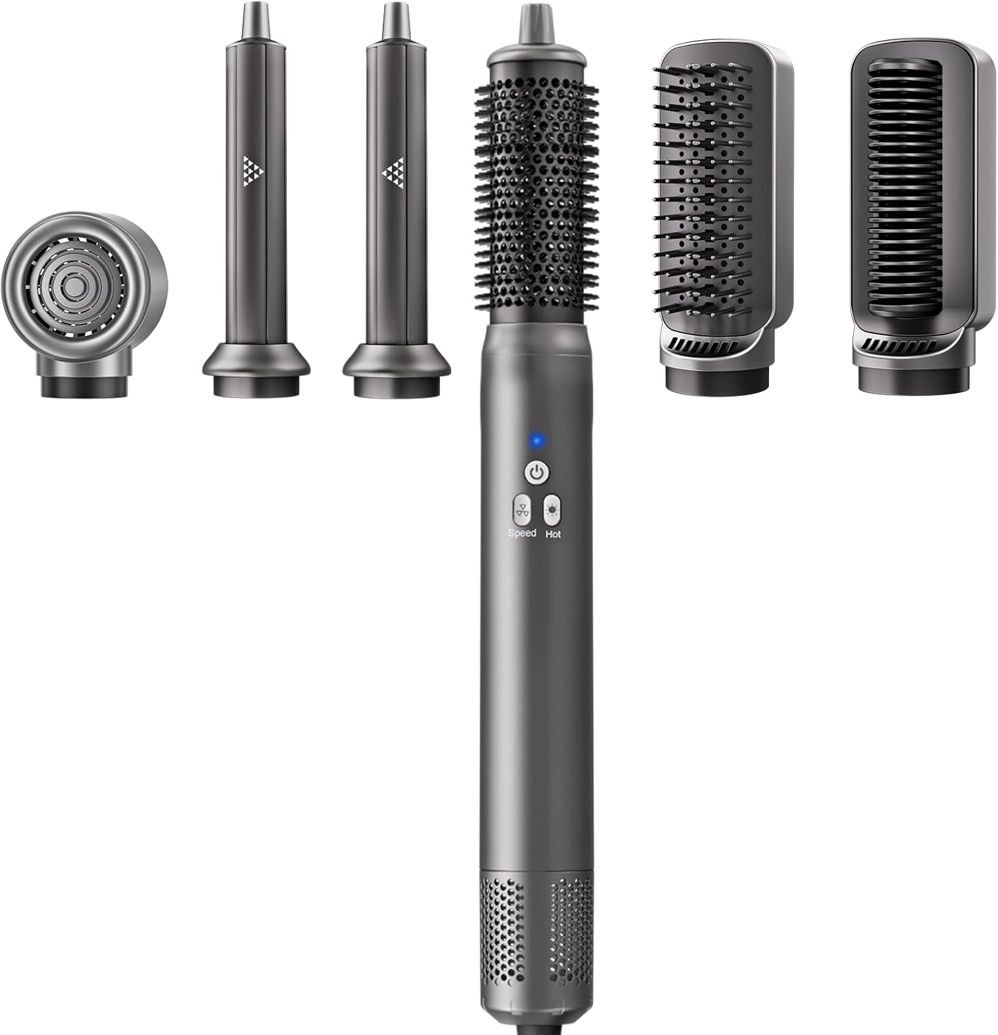 - 【UPGRADE 6 IN 1 AIR-WRAPS STYLING TOOLS】--Our multi versatile air styler can attach to the styling wand & hair dryer and give you the power to explore styles for any hair type.Hair Styler Brush includes 1x hair dryer for fast drying, 2 x 32mm left & right rotating curling iron for curling, 1x volumizing brush for volumizing, 1x hair straightener brush for smoothing and straightening ,1x sleeking brush for smoothing.
