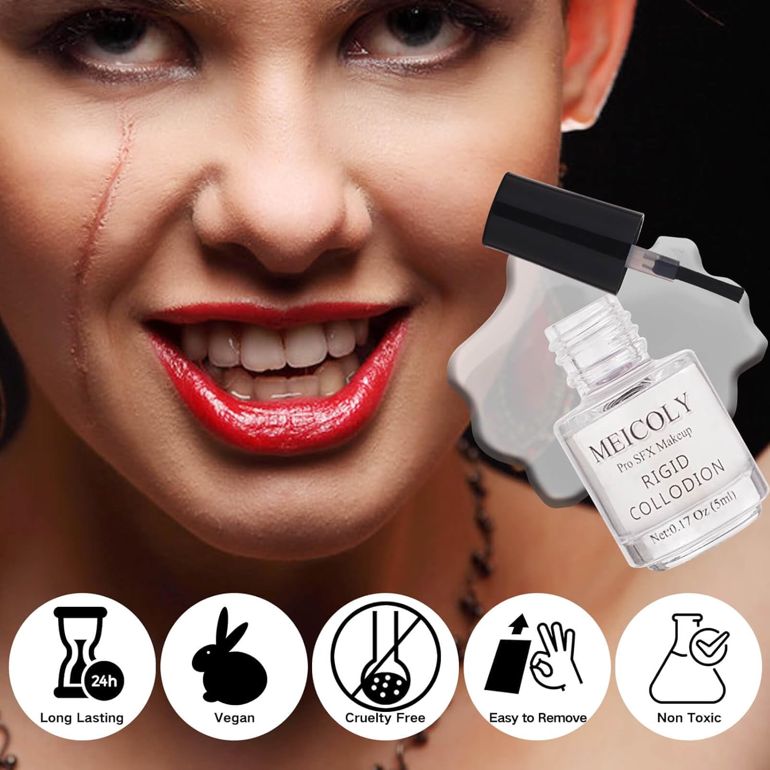 - To Create Realistic Scar Makeup:MEICOLY provides high-quality rigid collodion that dries quickly.The texture is fantastic,makes it real easy to make realistic scar,allowing for seamless integration with makeup for a truly authentic look,perfect for creating realistic scars and special effects.