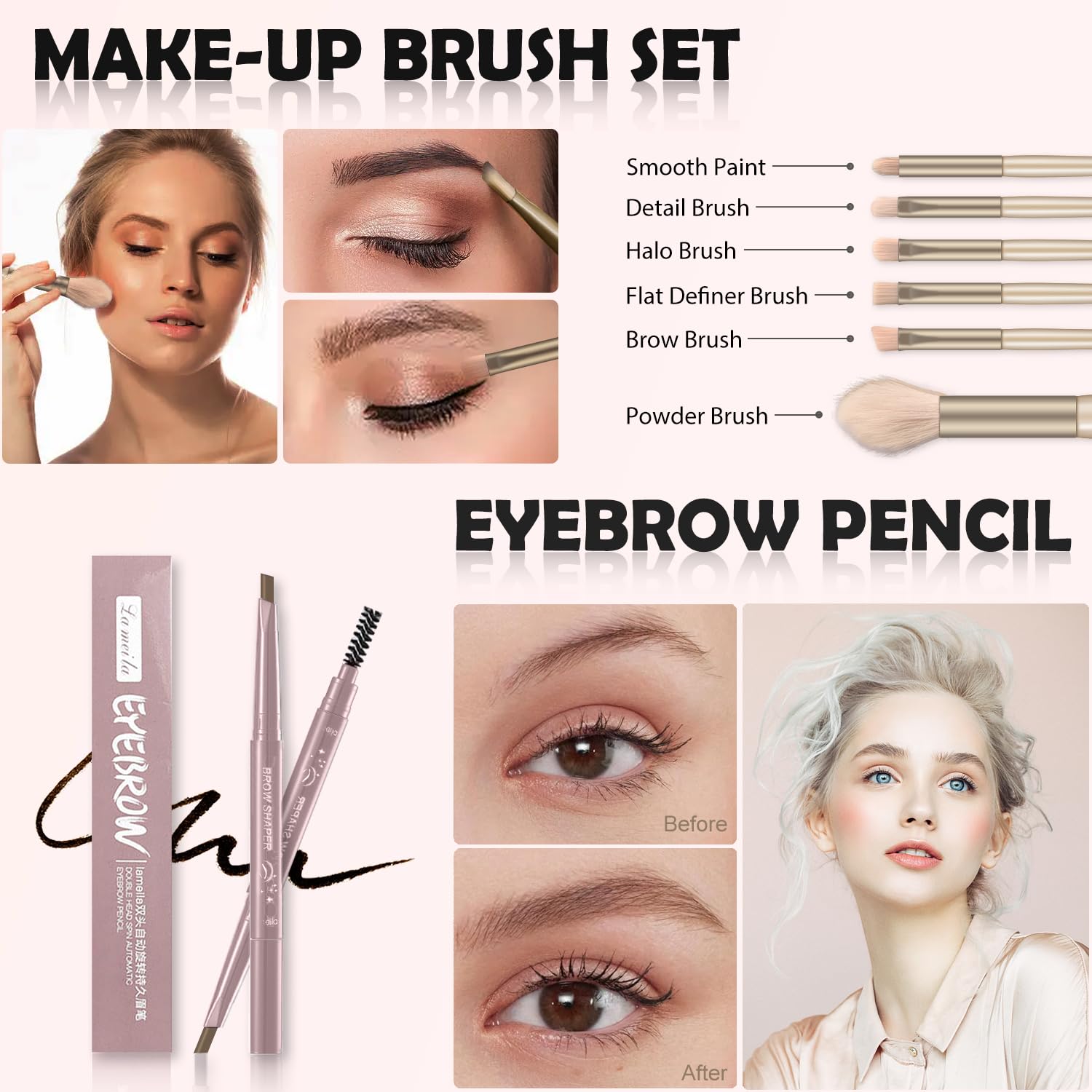 - 🍭【What's in the Makeup Set?】1 x 10 colors eyeshadow palette, 1 x waterproof and smudge-shield mascara, 1 x waterproof and smooth liquid eyeliner, 1 x Sepia eyebrow pencil, 1 x 6 pcs soft makeup brush set, 1 x lip gloss. Our eyeshadow palette's expertly curated shades are perfect for shading, highlighting, and defining eyes, brows, and the contours of the face.