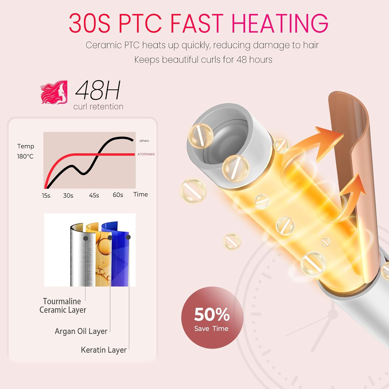 - RAPID 30-SECOND HEATING WITH PTC TECHNOLOGY: Atopskins mini curling iron heats up in just half a minute for quick styling; Travel curling iron advanced ceramic coating ensures even heat distribution for long-lasting curls; No more waiting around with slow heating travel hair curler
