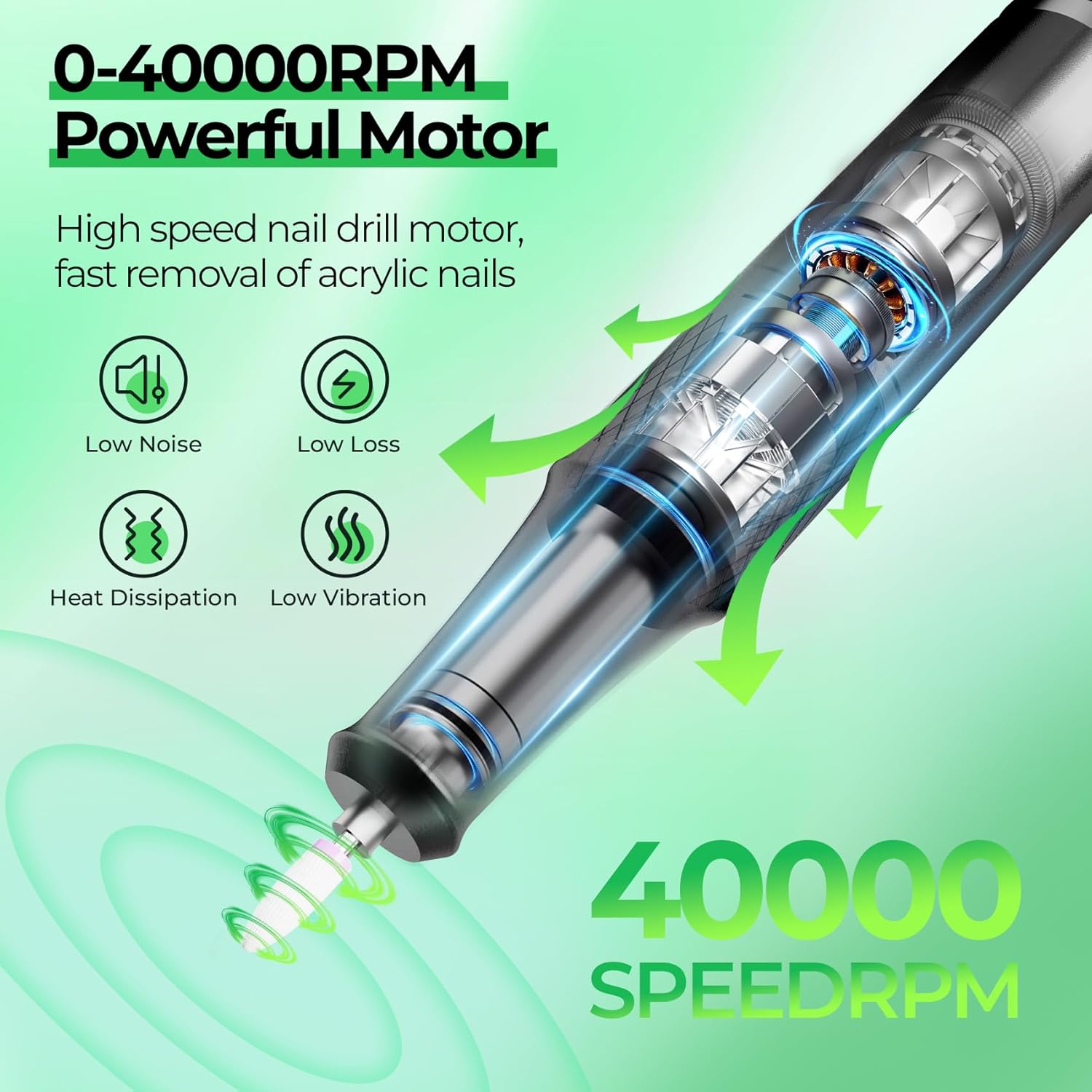 - 40000RPM Powerful Nail Drill Machine: JOSGLOI professional nail drill has a high-torque motor that delivers stable current power and speed, ensuring smooth operation even at high speeds (up to 40,000 RPM). Stable current and movement is a prerequisite for high speed, even the hardest nails can be easily handled. (Note: The JOSGLOI electric nail files are not rechargeable model)