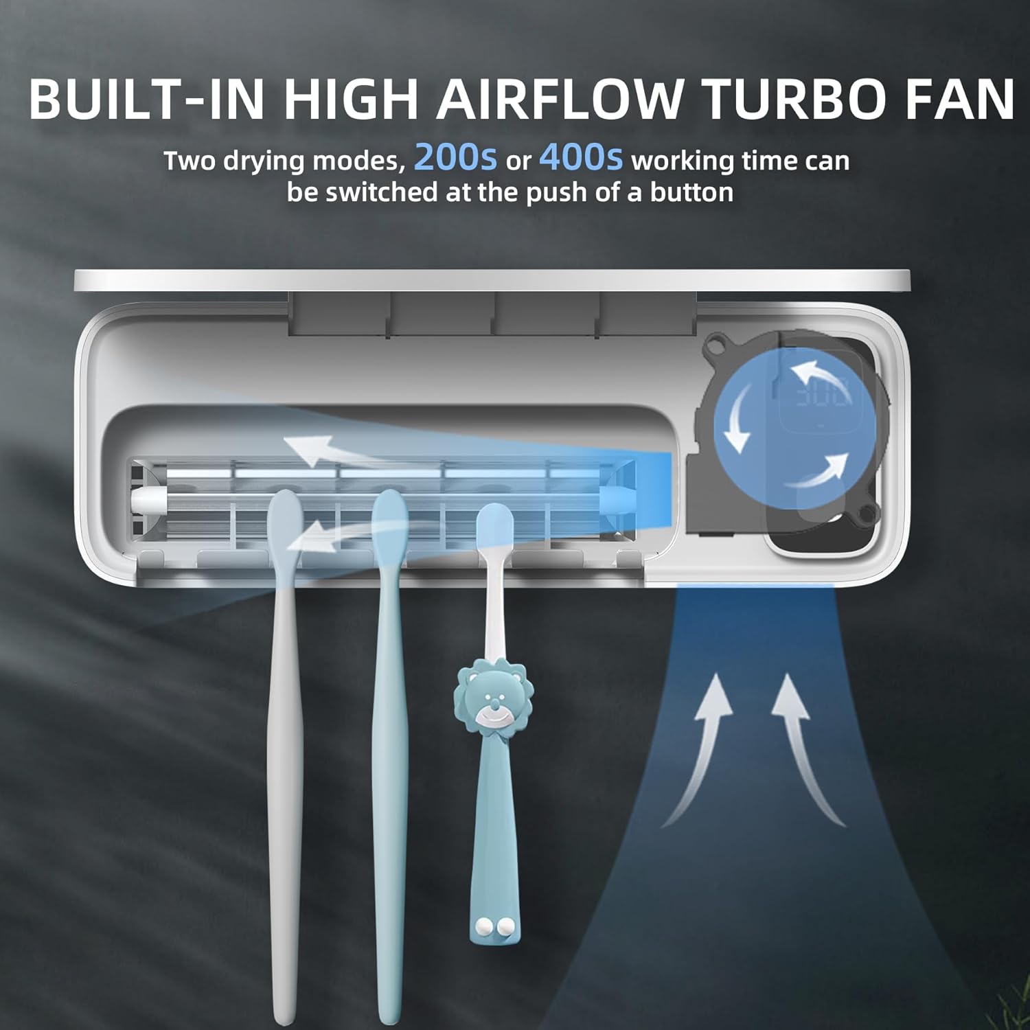 - Built-in Battery: Worried that there is no outlet in the bathroom? UV toothbrush holder built-in battery, easy to remove to charge and it can be used up to 50 times after being fully charged. Upgrade to 2 modes, switch between 200 seconds or 400 seconds of fan drying by pressing the button