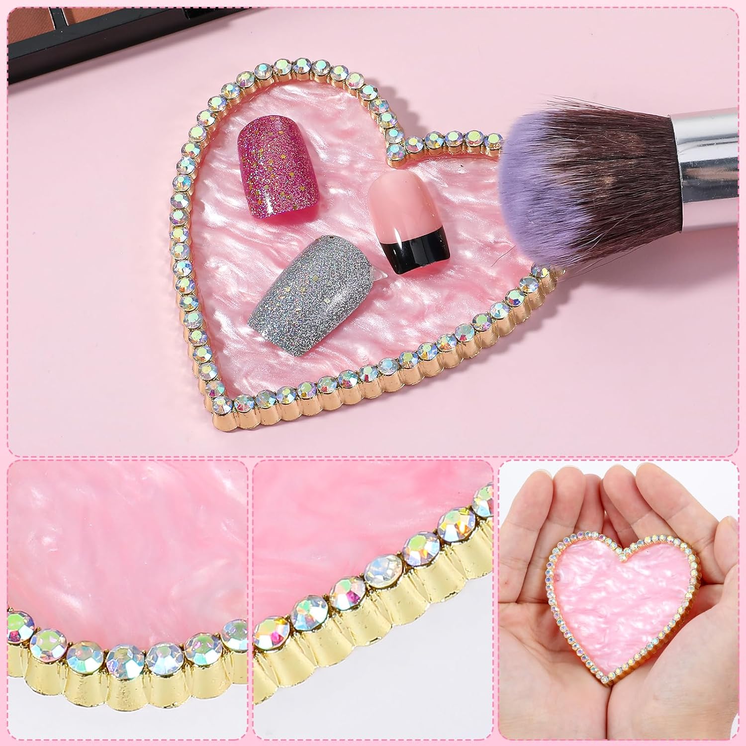 Sibba Resin Nail Art Palette, Golden Edge Nail Mixing Palette with Diamond, Polish Color Mixing Plate, Nail Holder Display Board, Heart Shape Cosmetic Mixing Tools for Women and Girls(Pink)