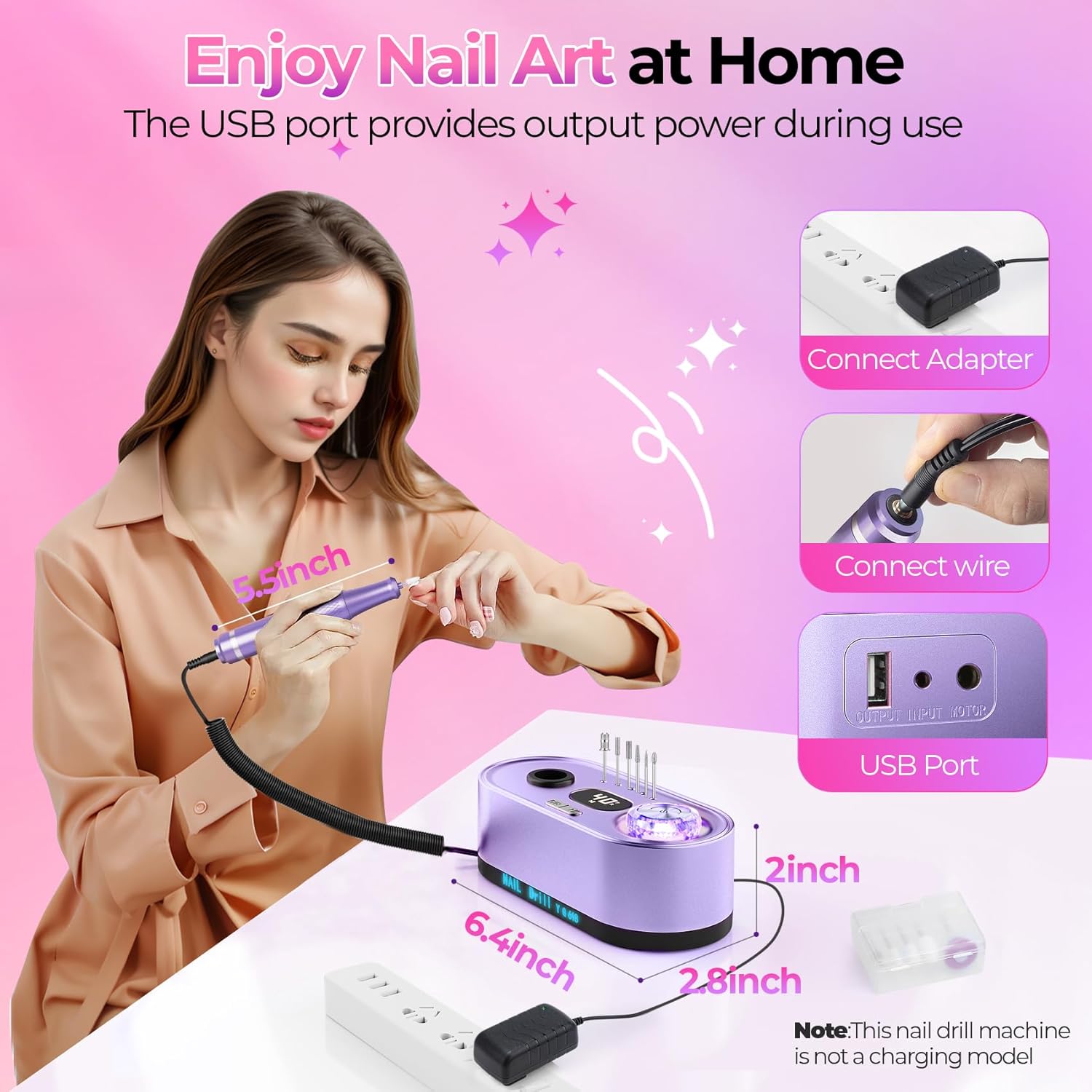 - Electric Nail Buffer & Complete Kit: This kit consists of 1* nail drill machine, 1* nail drill pen, 1* US dapter, 1* connecting line, 12* drill bits, 6* sanding bands, 1* use manual, everything you need for efficient nail care. The GOLEEXU nail drill is the best choice for you to do your nails.(Note: The GOLEEXU electric drill corded is not a charging model)