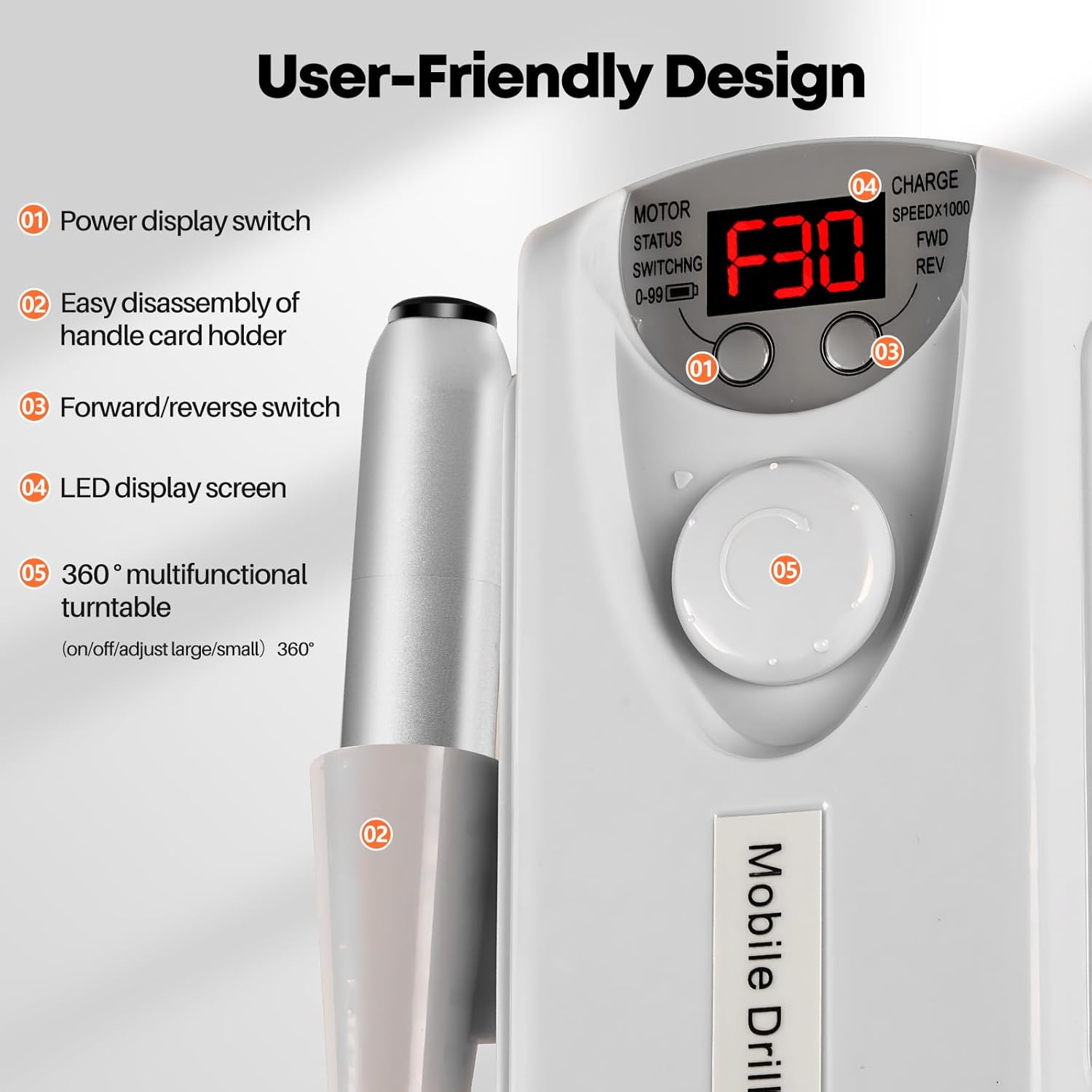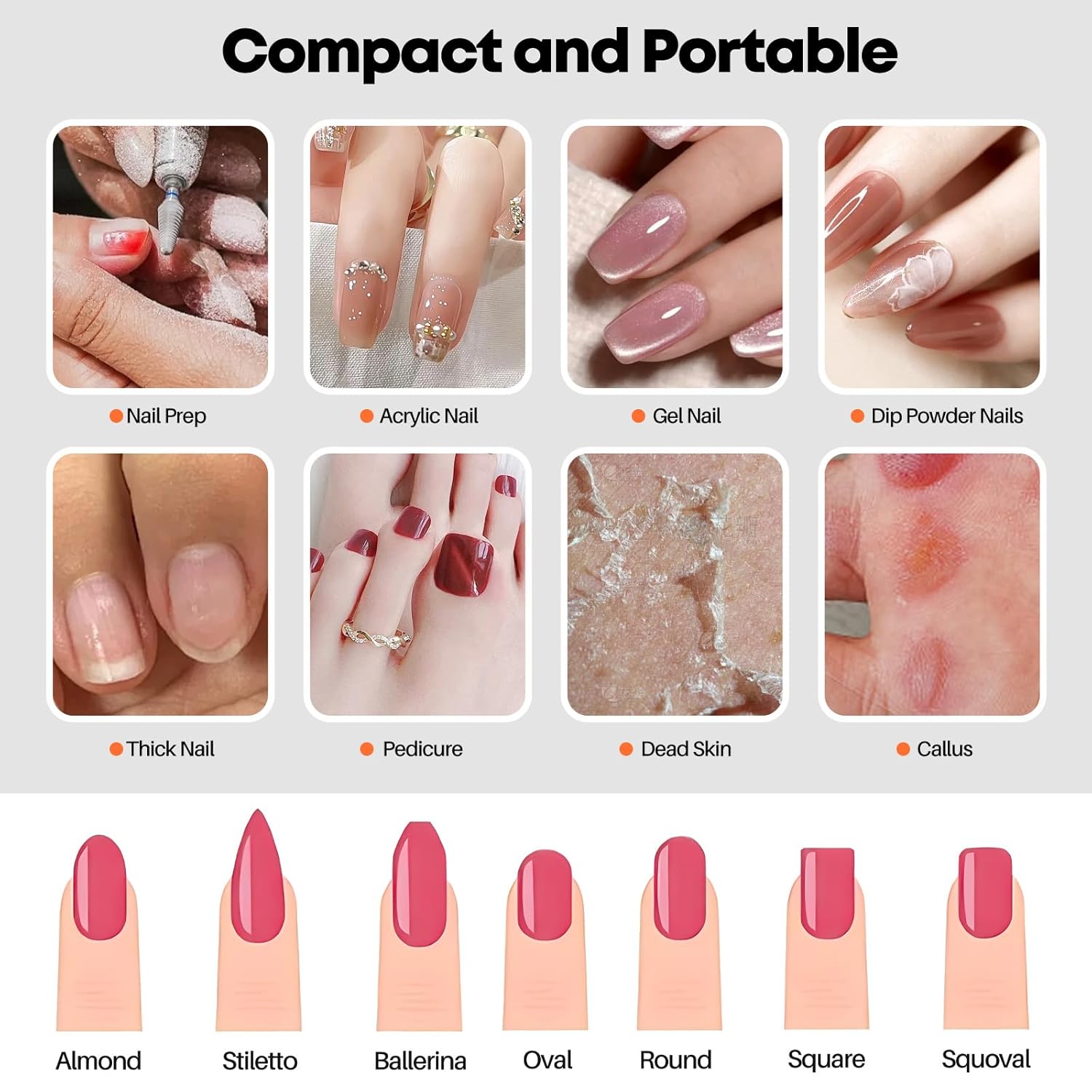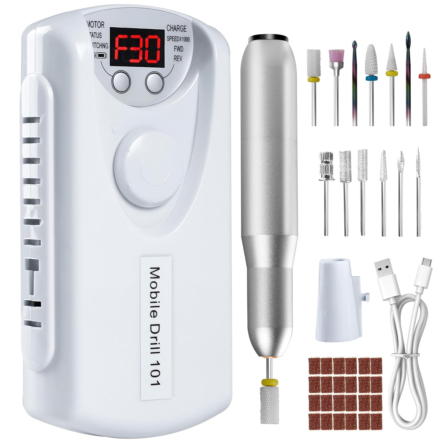 - 30000 RPM Pro-Expert Nail Drill kit: Designed for professional nail drill, that can remove acrylic nails in just 3 minutes. This nail drill kit includes 1*nail drill machine, 1*nail drill pen, 1*pen holder, 1*connecting line, 1* USB data line, 13* drill bits, 50* sanding bands.Ortable electric nail file is also the best gift for female friends
