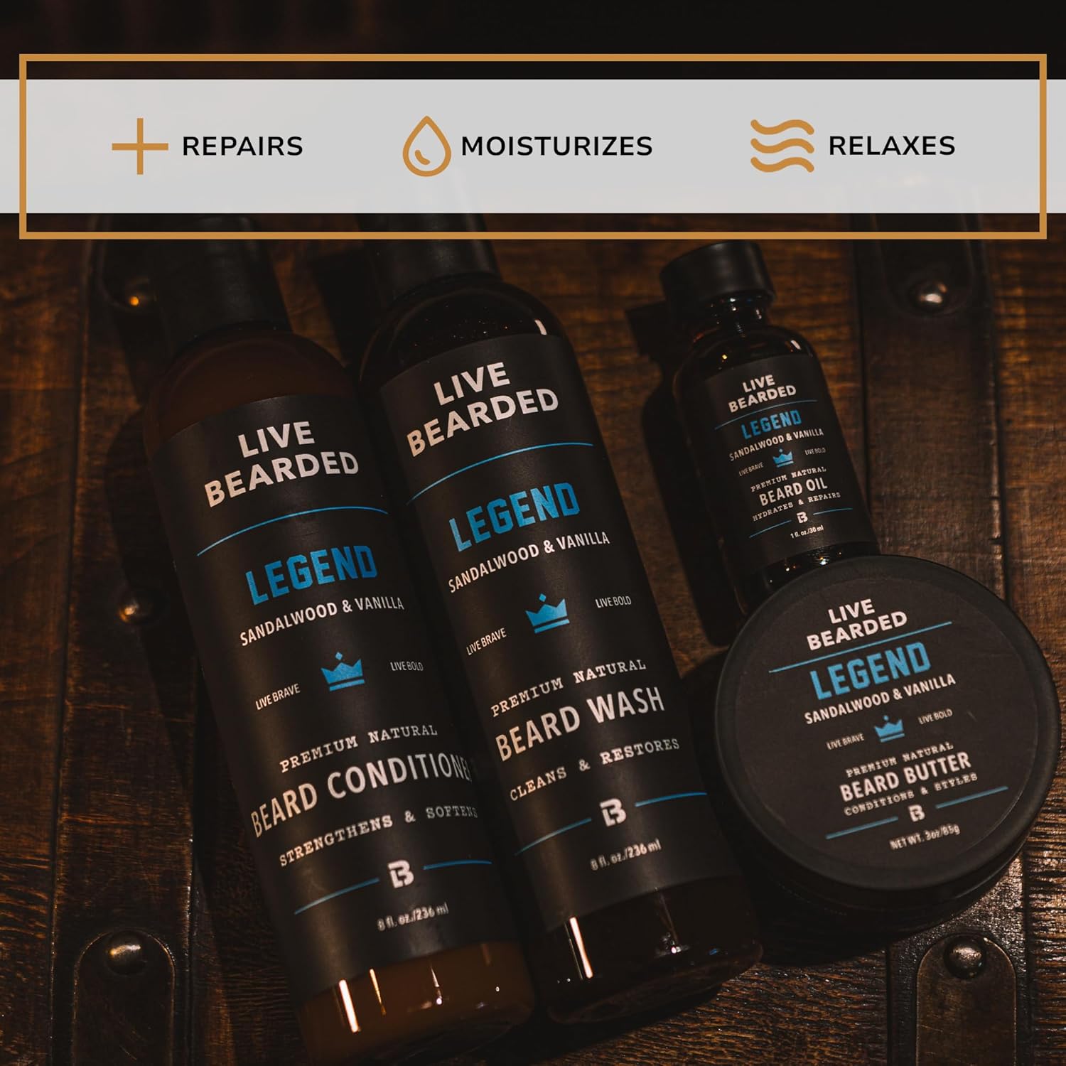 Live Bearded Complete Beard Grooming Kit - Wash, Conditioner, Butter and Oil - Made in the USA with All-Natural Ingredients - Mens Groom Set | Legend Scent - Sandalwood, Vanilla