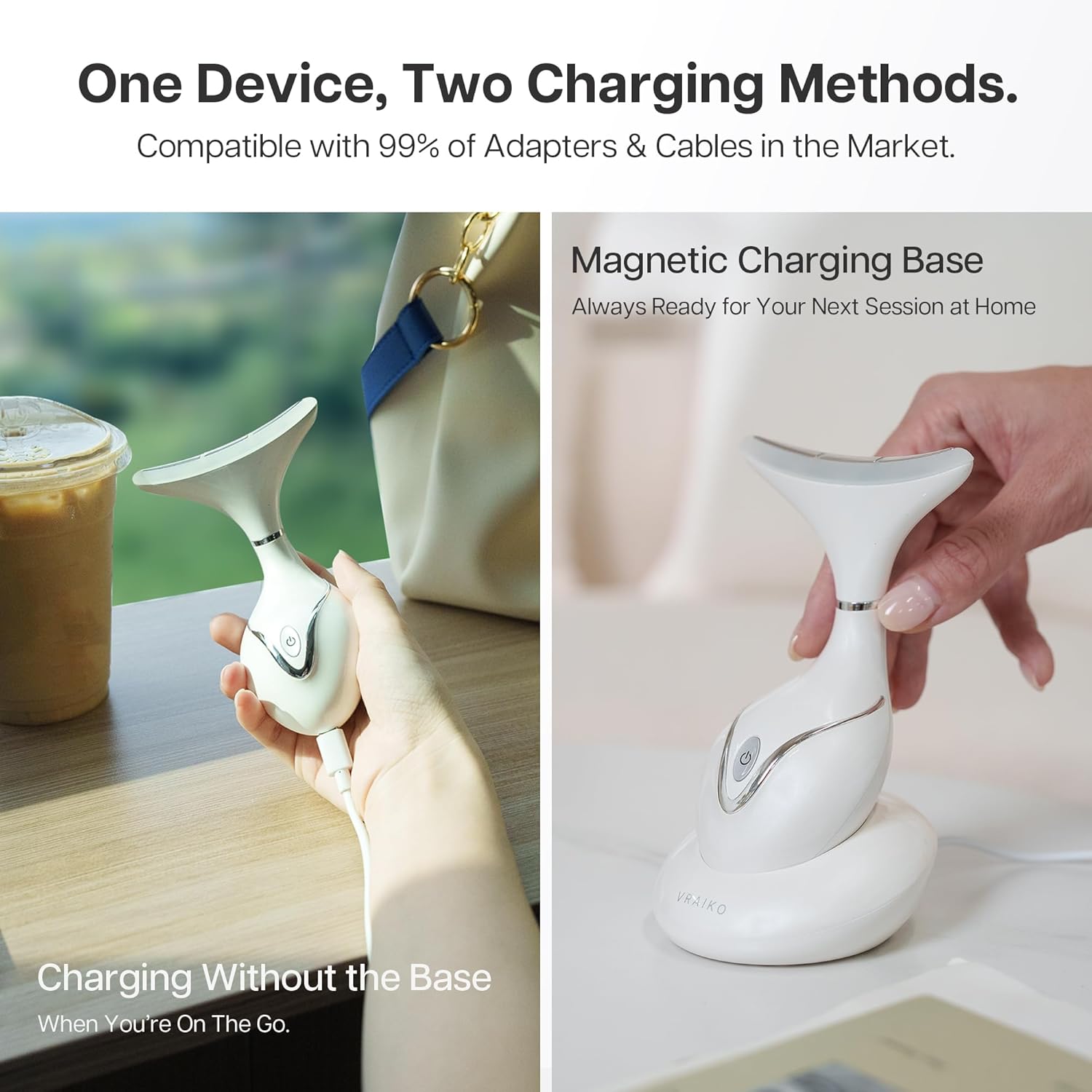 - 【Travel Friendly Design】 One Device, Two Charging methods. The VRAIKO Iris offers versatile charging options to suit your lifestyle. At home, the magnetic charging base keeps your space tidy while ensuring the device is always ready for your next skincare session. When you’re on the go, whether traveling for vacation or business, the compact device can be conveniently charged via any USB-C cable, without the need for the base. Compatible with both fast and slow chargers, it ensures an effortless skincare routine, wherever you are, without the hassle of extra cables.