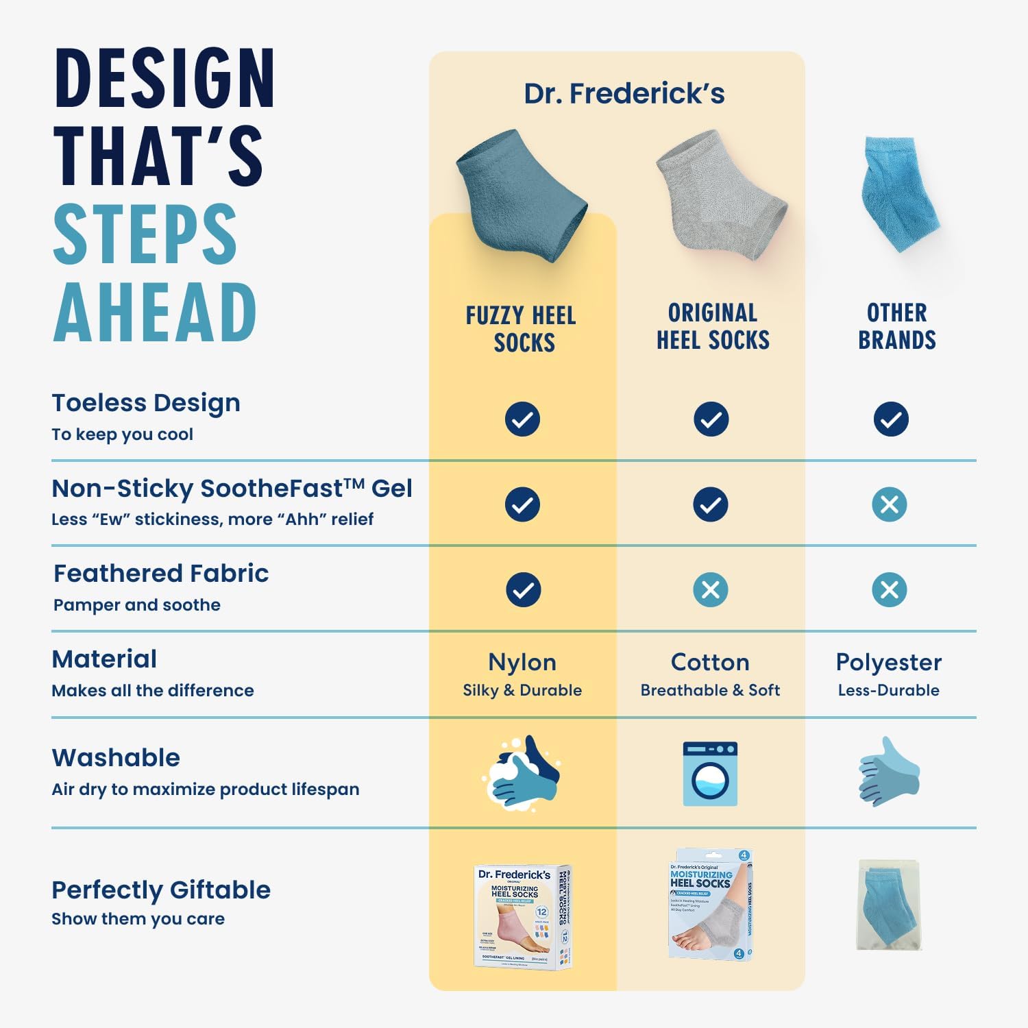 - Visible Results Fast: Dr. Frederick’s Original Fuzzy Heel Socks are expertly developed to transform dry, rough feet into soft, smooth soles. Most users see a difference after just one night, with best results achieved after one week of consistent use.