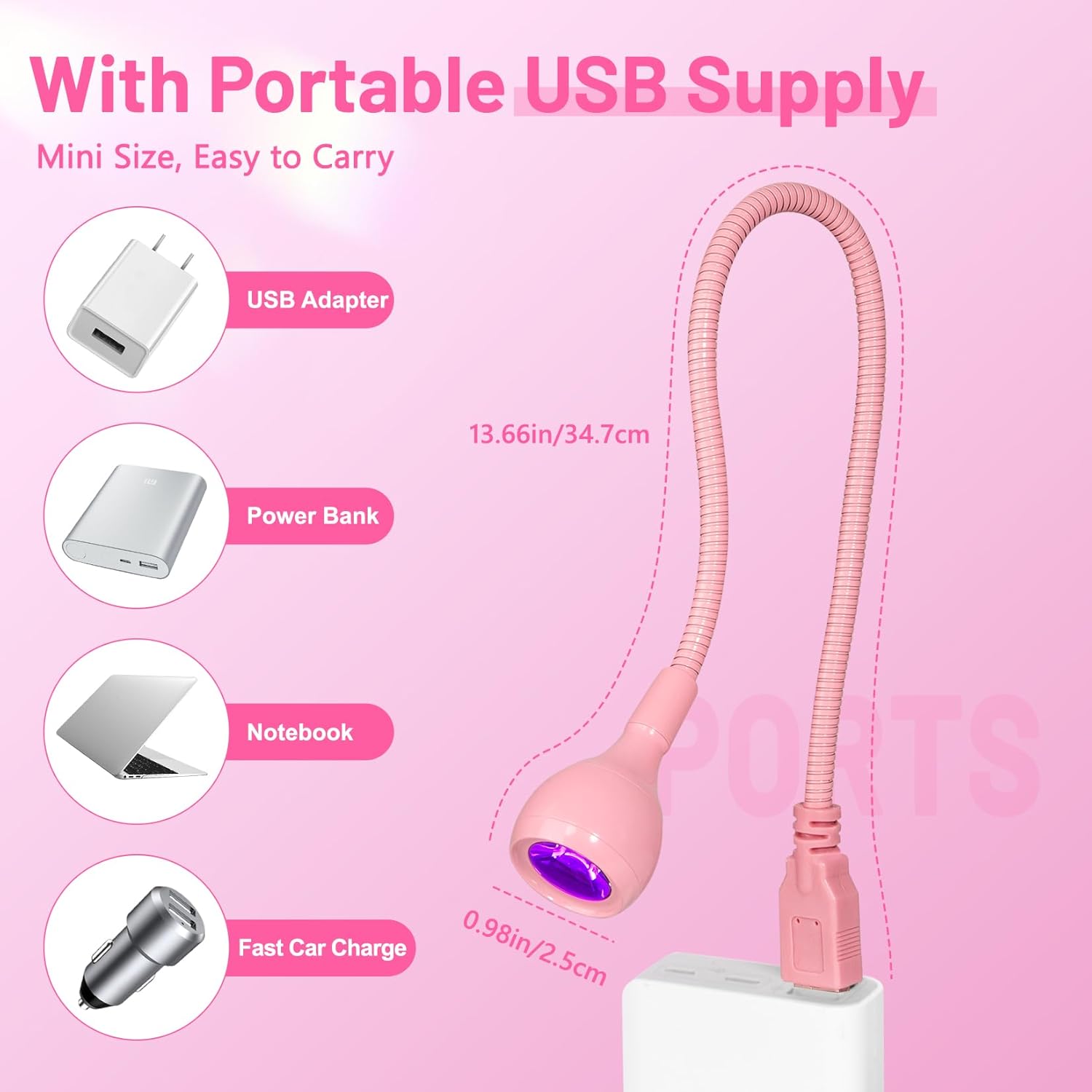 - 【USB Powered Plug Play】AORAEM Duck neck uv nail lamps nail light with 3W Purple LED lamp beads. UV LED nail lamp for gel nails is used with a USB connection to the power supply. Wide range of uses led nail dryer that connect USB on a Notebook, Portable Battery, Charger, PC USB, etc. Pink LED nail light is easy to use, Plug & Play, so you can light up anytime, anywhere.