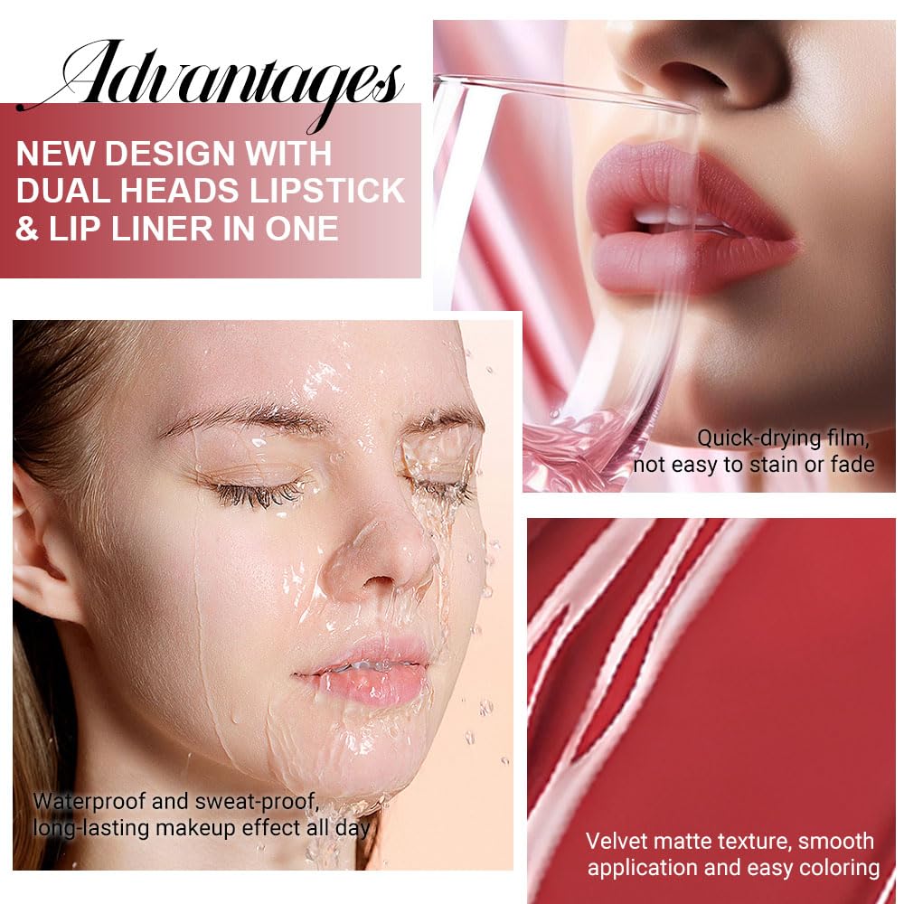 - 【2 IN 1 Lip Liner & Liquid Lipstick】The double ended design made you can use lipstick and lip liner on both ends. New design with dual heads lipstick & lip liner in one, for draw delicate lip line before applying lipstick. It combines lip line and liquid lipstick and makes double-end lipstick more perfect,meets the need of all occasions.