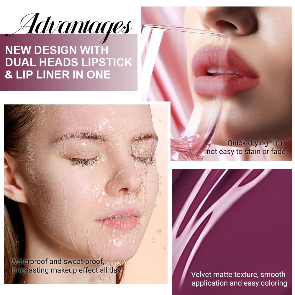 - 【2 IN 1 Lip Liner & Liquid Lipstick】The double ended design made you can use lipstick and lip liner on both ends. New design with dual heads lipstick & lip liner in one, for draw delicate lip line before applying lipstick. It combines lip line and liquid lipstick and makes double-end lipstick more perfect,meets the need of all occasions.
