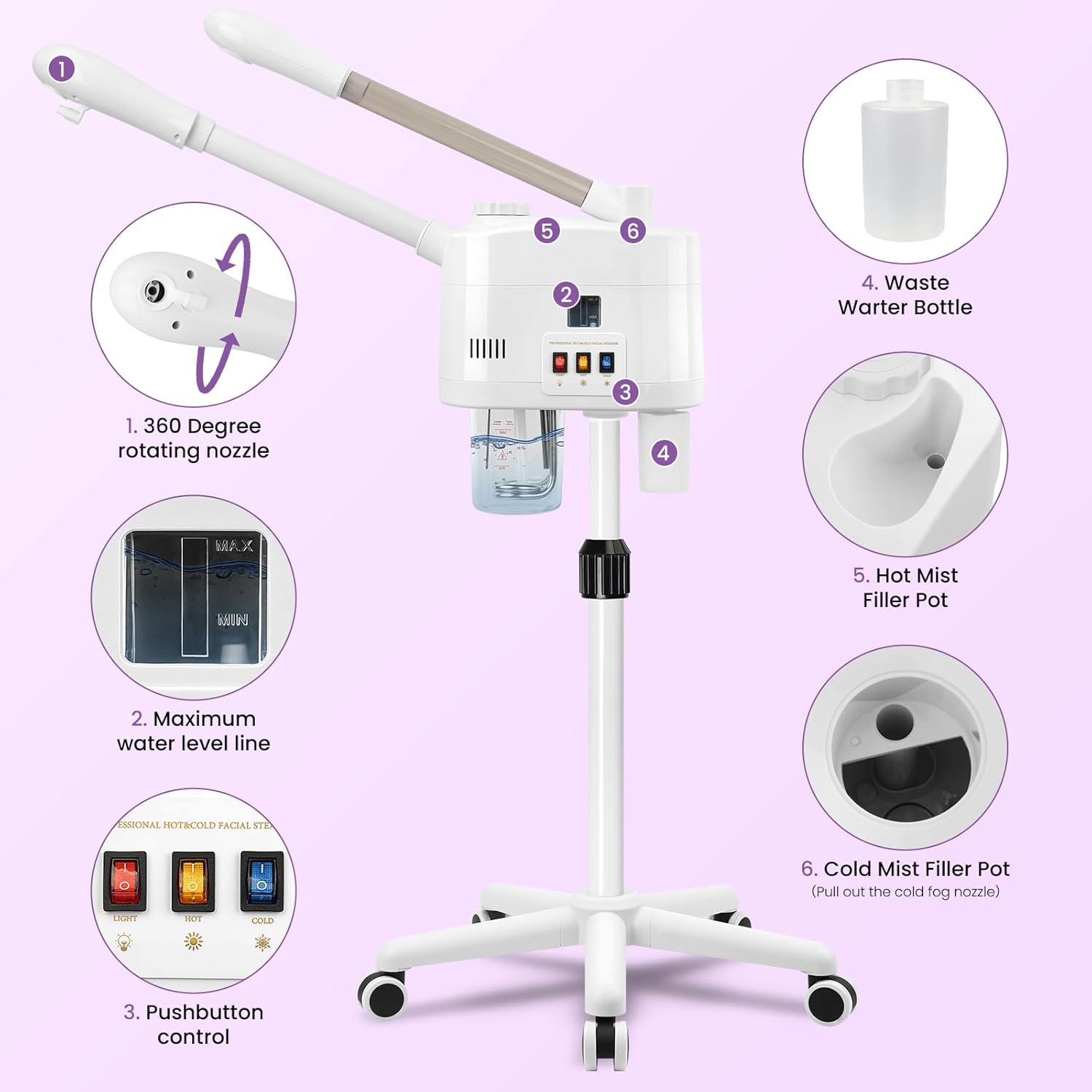 - 【Facial Steamer Adjustable】Adjustable height form 36-52 Inches, 360°rotatable and smooth wheels, 360°rotatable main body, 360°rotatable nozzle, adapt to a variety of needs.