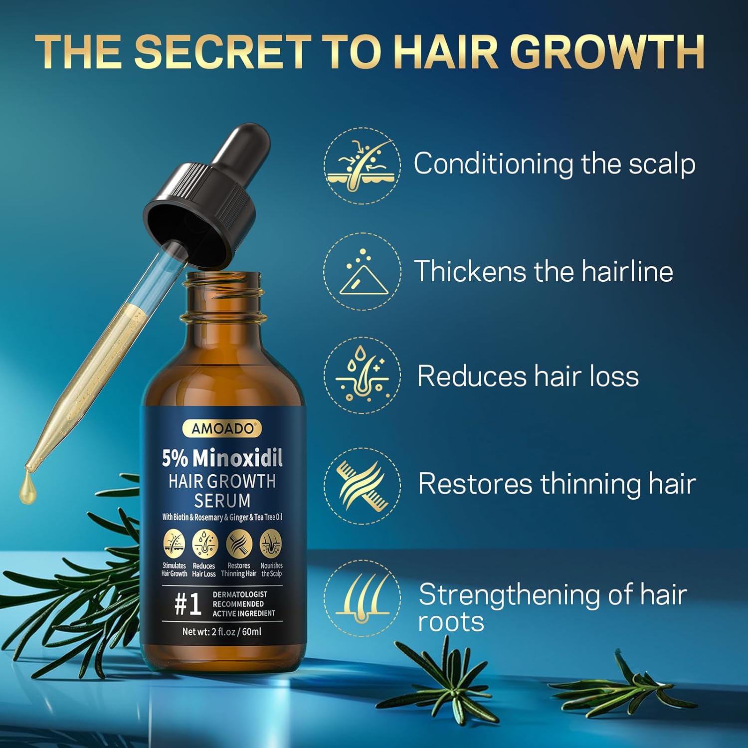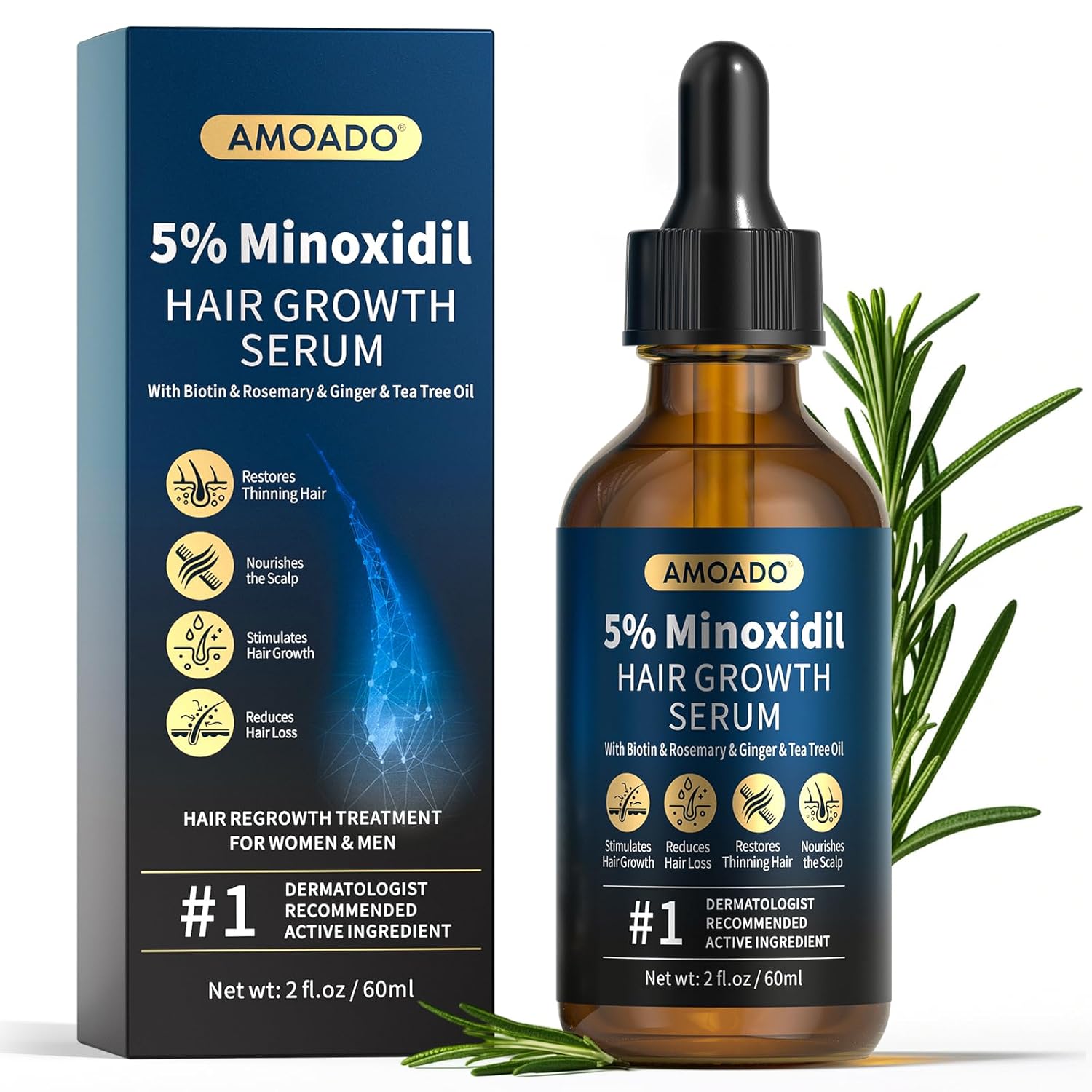 - 5% Minoxidil Effective-ingredients▶ AMOADO minoxidil hair growth serum enriched with natural rosemary,biotin,ginger,tea tree extract, target hair loss by re-activating hair follicles. Rosemary oil conditions and strengthens sparse and fragile hair from the roots. Our premium 5% minoxidil for women and men stimulates growth for thicker,strengthen hair, also for men beard growth. Available Product NDC: 85158-001
