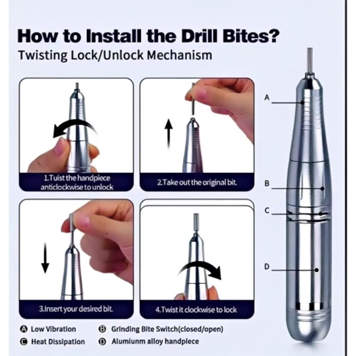 - Our electric nail drill is built to last, nail dremel kit,the professional nail drill features an aluminum alloy casing and ventilation holes to prevent your phone from overheating, the nail drill's lightweight ergonomic design is comfortable to use. The handle fits 3/32 inch drill bits. Twist-lock chuck makes it easy to change bits. Professional Nail Drill features an upgraded motor that spins up to 45,000 RPM for more consistent variable speed control with the drill for nails kit!