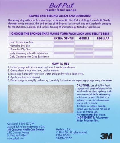 Buf-Puf Regular Facial Sponge, Dermatologist Developed, Removes Deep Down Dirt & Makeup that Causes Breakouts and Blackheads, Reusable, Exfoliating, White, 1 Count (Pack of 3)