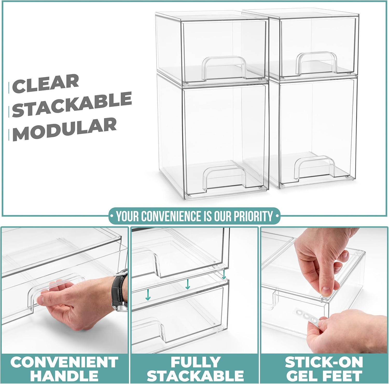 - Sorbus Clear Organizer Drawers: Stackable organizer for multifunctional storage. Customize your space with this acrylic bathroom organizer for endless organization.
