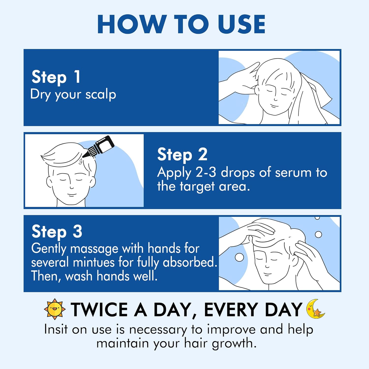- Easy Application: Apply this hair regrowth treatment directly to the affected area on clean, dry hair or beard, then gently massage for several minutes until fully absorbed. Use twice a day and 8-12 weeks of Consistant Use for the best and maximum results.