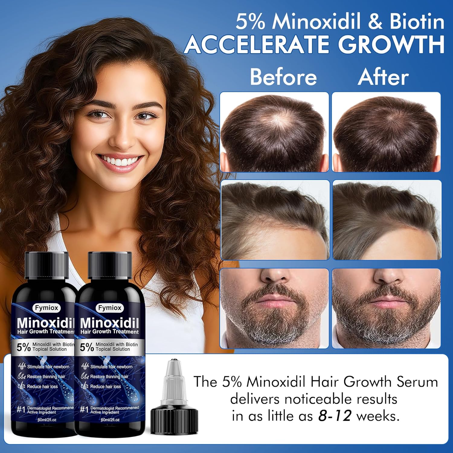 - Powerful Formula: Fymiox 5 percent Minoxidil for men and women hair growth combines Monoxide 5% with Biotin, polygonum multiflorum extract, platycladus orientalis leaf extract, ginger root extrat ect., clinically proven to revitalize thinning hair, promote healthy and natural hair & beard regrowth faster and continuously.