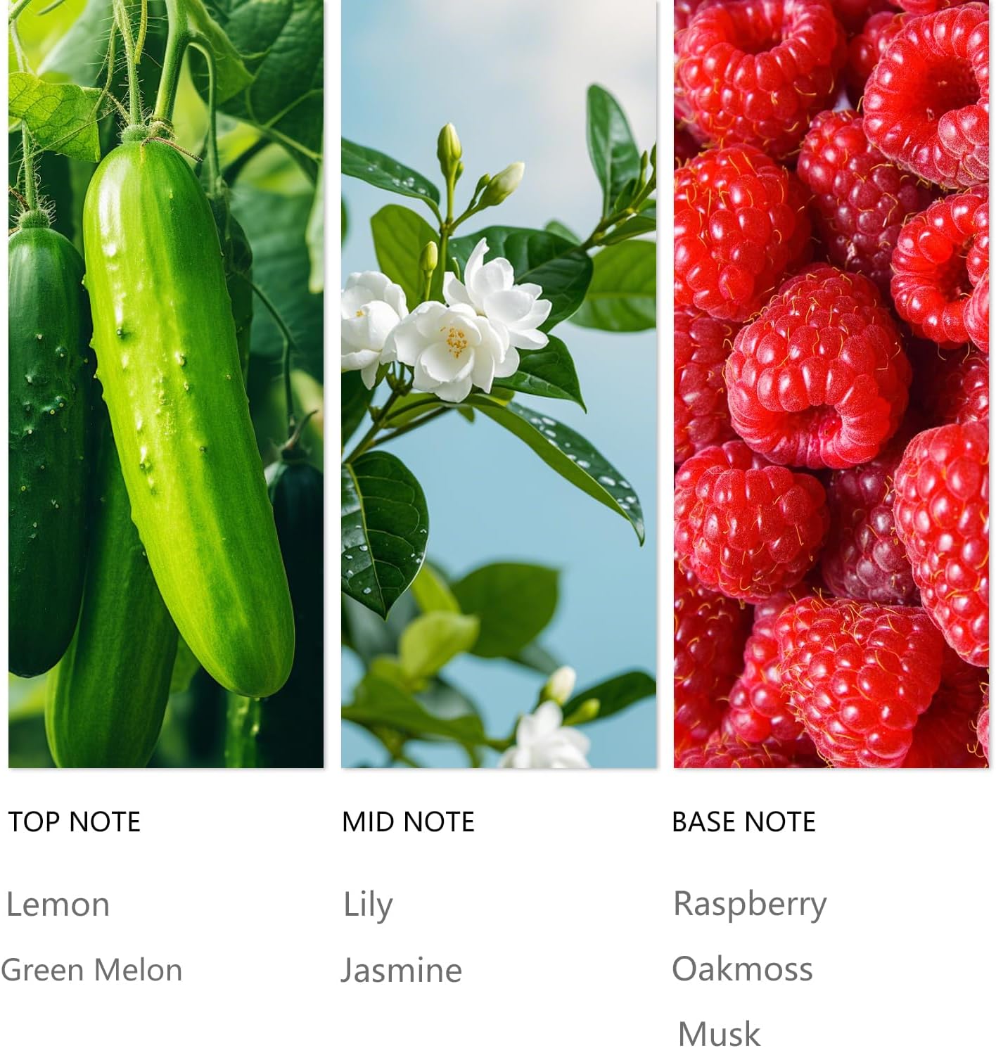 - Top notes:Lemon, Green Melon; Mid notes: Lily, Jasmine; Base notes:Raspberry, Oakmoss, Musk