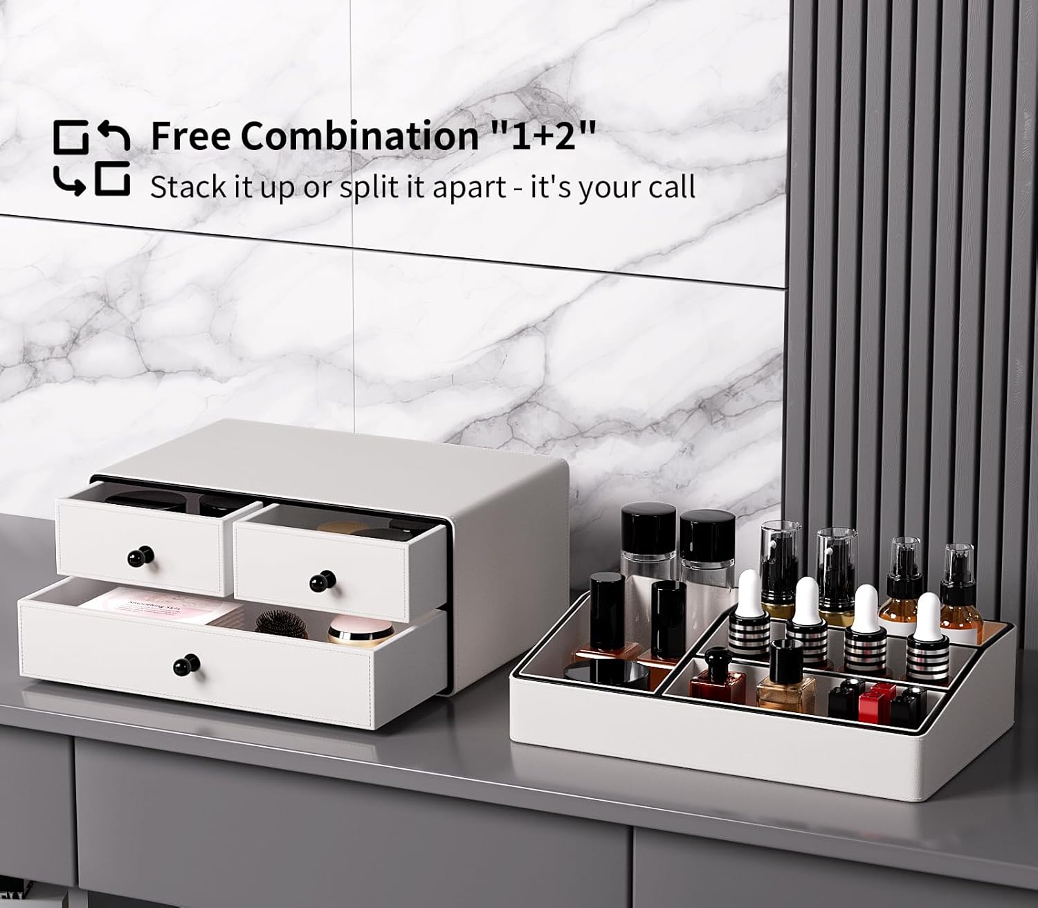 - Stackable 2-Tier Design: The top makeup tray and bottom drawer makeup holder are stackable, allowing you to arrange them according to your space's needs. It fits in various areas such as bedside tables, vanities, offices, and under sinks.
