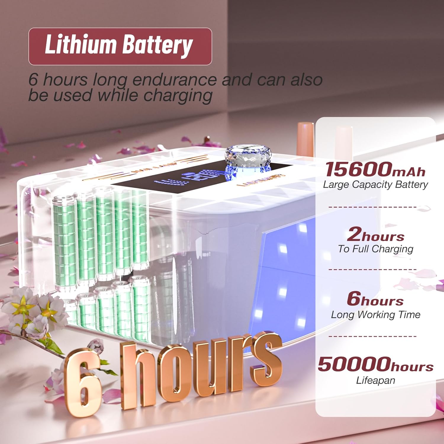 - [Cordless Rechargeable Nail Lamp] This ultra long endurance UV LED nail lamp cordless is equipped with a rechargeable battery, which can be used for 6 hours after being fully charged (One hour). The service life exceeds 50000 hours. This portable UV light for gel nails can be carried anywhere without an extension cord. (Note: You can use it while charging)
