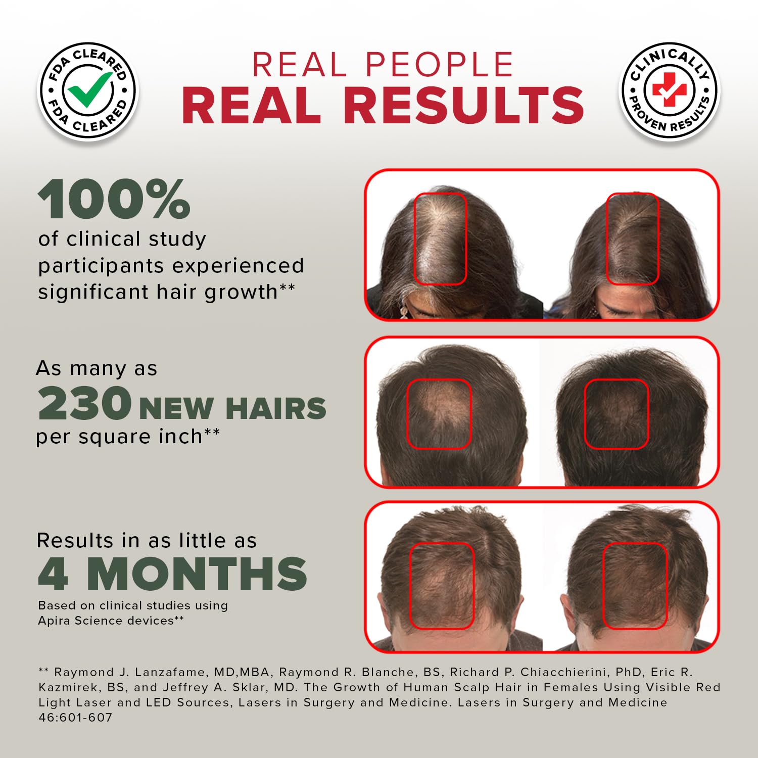 - FDA-Cleared: Hair growth device clinically-proven 100% effective in hair regrowth for men and women. Two double-blind placebo hair loss treatment clinical trials. Results peer-reviewed and published in the Lasers in Surgery and Medicine medical journal.