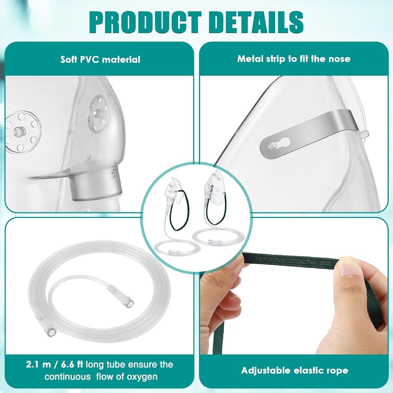 - Thoughtful Design: The oxygen mask for adult comes with an adjustable elastic headband that suits different head sizes, ensuring a safe, comfortable fit without slipping. It is further enhanced by a malleable nose clip that allows for precise adjustment of the nose profile, proper sealing to ensure optimal oxygen delivery, and a 7 foot anti kinking tube that allows for barrier free movement and consistent oxygen flow; This feature also helps prevent oxygen leaks, maximizing efficiency