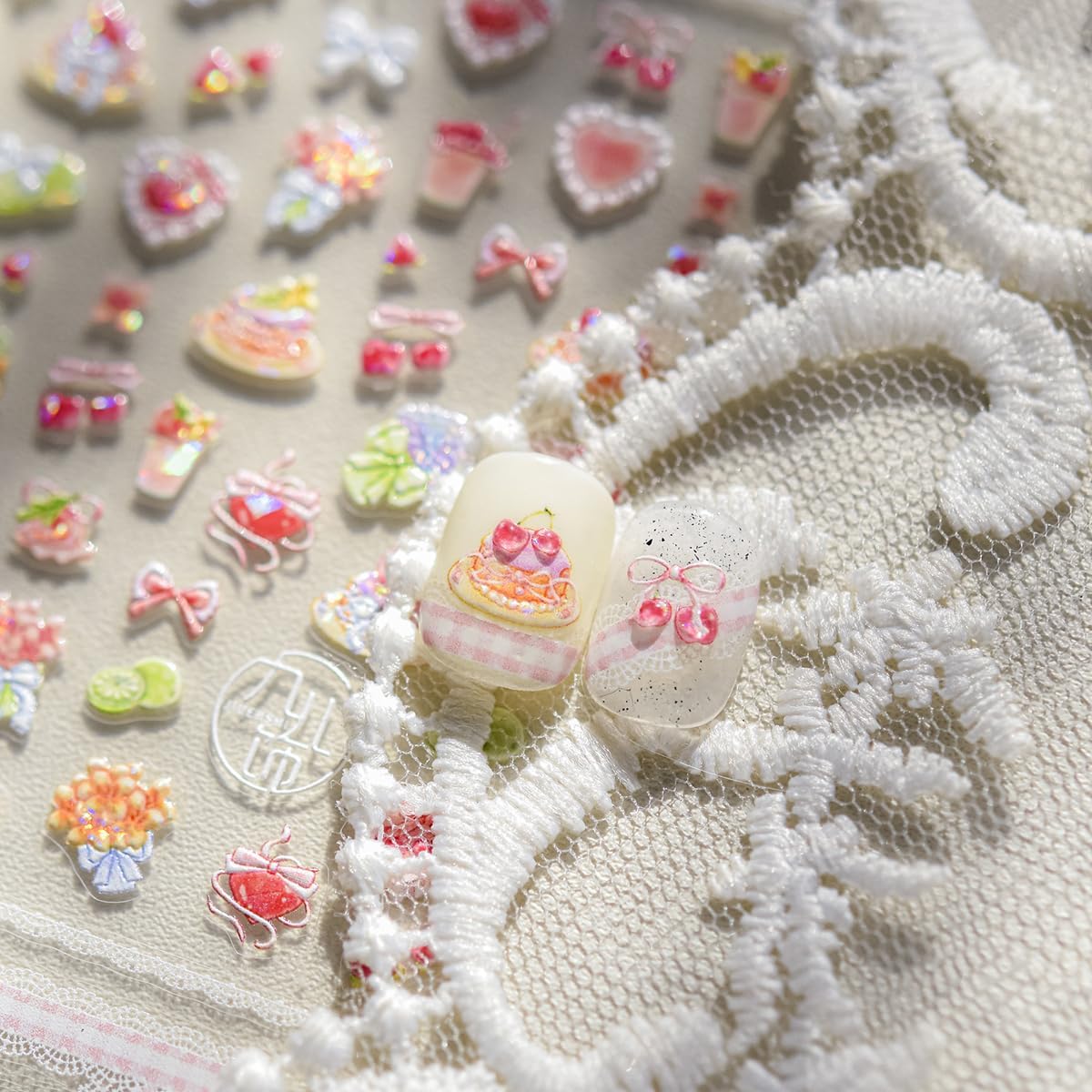 5D Embossed Shortcake Nail Stickers for Nail Art Pink Bow Heart Nail Decals Summer Cute Stickers for Nails Designs Self Adhesive Nail Supplies & Decorations for Women Girls 1 Sheet